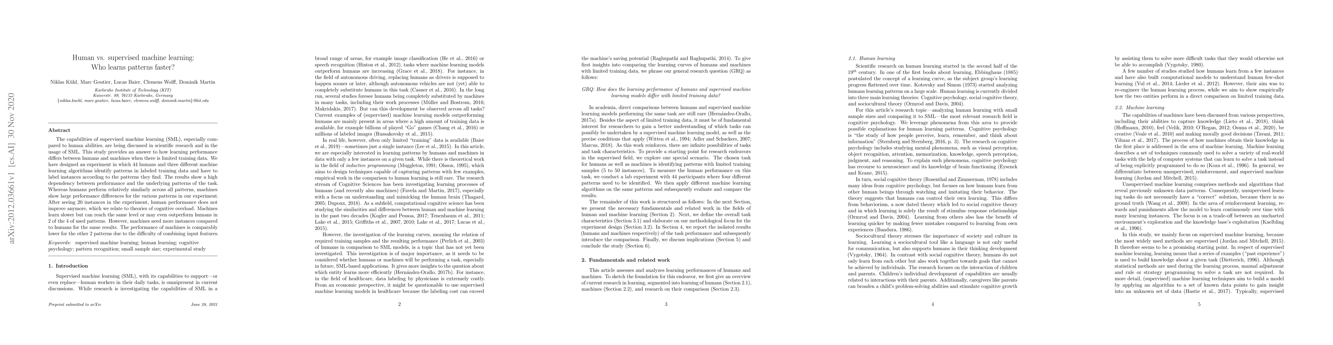 The capabilities of supervised machine learning (SML), especially compared to human abilities, are being discussed in scientific research and in the usage of SML. This study provides an answer to how learning performance differs between humans and machines when there is limited training data. We have designed an experiment in which 44 humans and three different machine learning algorithms identify patterns in labeled training data and have to label instances according to the patterns they find. The results show a high dependency between performance and the underlying patterns of the task. Whereas humans perform relatively similarly across all patterns, machines show large performance differences for the various patterns in our experiment. After seeing 20 instances in the experiment, human performance does not improve anymore, which we relate to theories of cognitive overload. Machines learn slower but can reach the same level or may even outperform humans in 2 of the 4 of used patterns. However, machines need more instances compared to humans for the same results. The performance of machines is comparably lower for the other 2 patterns due to the difficulty of combining input features.