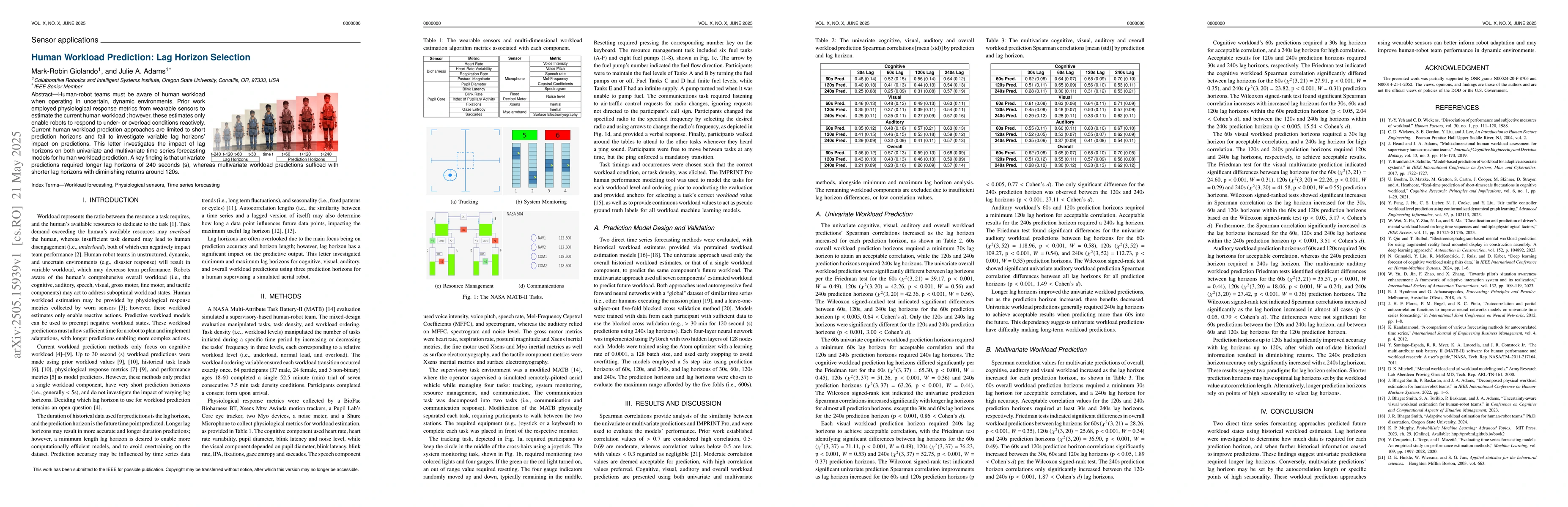Research investigates how lag horizons affect human workload prediction accuracy, finding that univariate predictions require longer lag horizons but multivariate models can predict with shorter horizons.