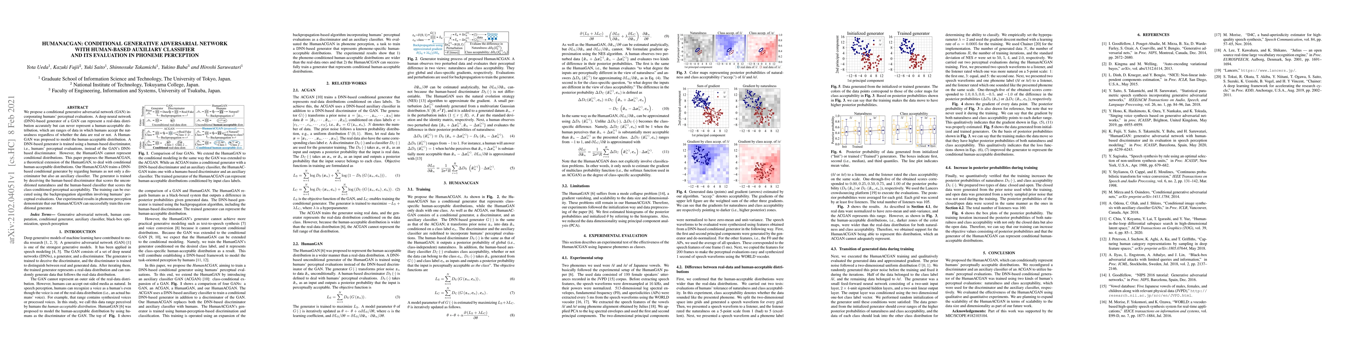 This paper proposes HumanACGAN, a conditional GAN that uses human perceptual evaluations as both a discriminator and an auxiliary classifier to model human-acceptable distributions. Experimental results in phoneme perception show its effectiveness in training a conditional generator.