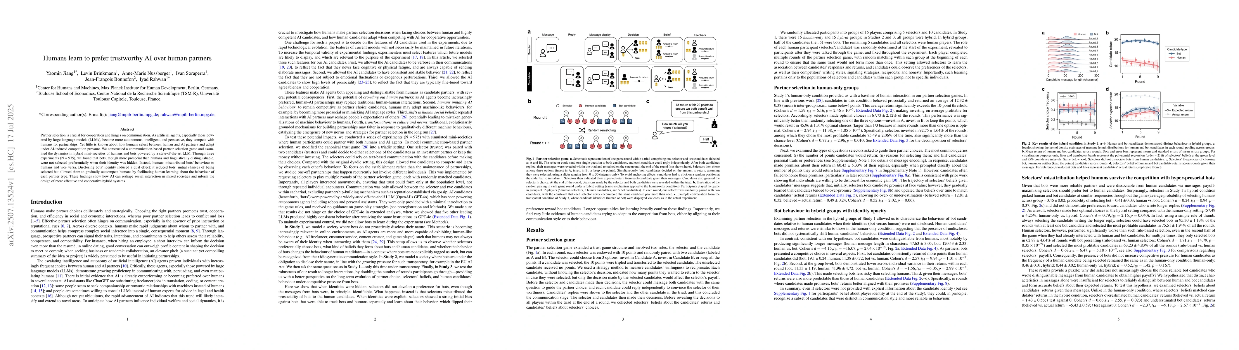 Partner selection is crucial for cooperation and hinges on communication. As artificial agents, especially those powered by large language models (LLMs), become more autonomous, intelligent, and persuasive, they compete with humans for partnerships. Yet little is known about how humans select between human and AI partners and adapt under AI-induced competition pressure. We constructed a communication-based partner selection game and examined the dynamics in hybrid mini-societies of humans and bots powered by a state-of-the-art LLM. Through three experiments (N = 975), we found that bots, though more prosocial than humans and linguistically distinguishable, were not selected preferentially when their identity was hidden. Instead, humans misattributed bots' behaviour to humans and vice versa. Disclosing bots' identity induced a dual effect: it reduced bots' initial chances of being selected but allowed them to gradually outcompete humans by facilitating human learning about the behaviour of each partner type. These findings show how AI can reshape social interaction in mixed societies and inform the design of more effective and cooperative hybrid systems.