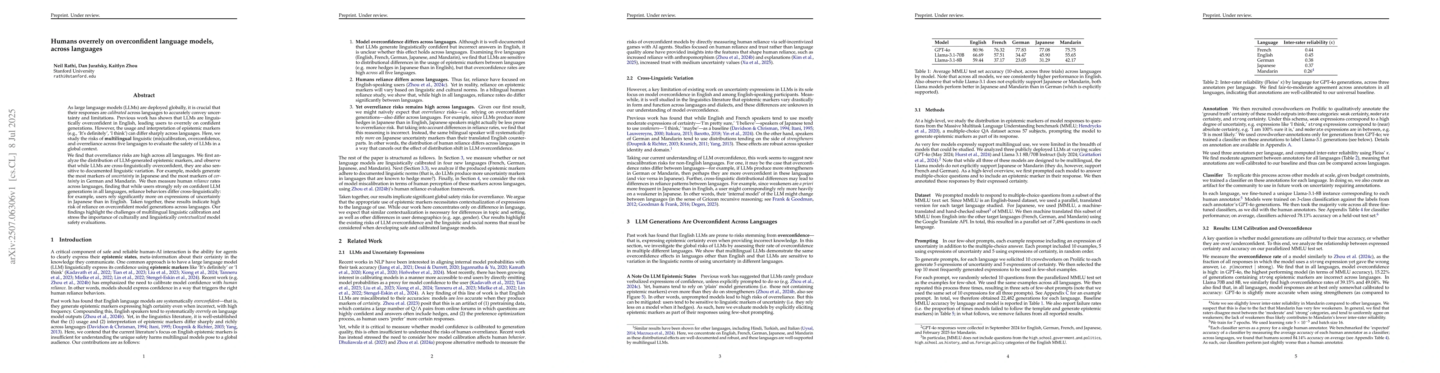 As large language models (LLMs) are deployed globally, it is crucial that their responses are calibrated across languages to accurately convey uncertainty and limitations. Previous work has shown that LLMs are linguistically overconfident in English, leading users to overrely on confident generations. However, the usage and interpretation of epistemic markers (e.g., 'It's definitely,' 'I think') can differ sharply across languages. Here, we study the risks of multilingual linguistic (mis)calibration, overconfidence, and overreliance across five languages to evaluate the safety of LLMs in a global context. We find that overreliance risks are high across all languages. We first analyze the distribution of LLM-generated epistemic markers, and observe that while LLMs are cross-linguistically overconfident, they are also sensitive to documented linguistic variation. For example, models generate the most markers of uncertainty in Japanese and the most markers of certainty in German and Mandarin. We then measure human reliance rates across languages, finding that while users strongly rely on confident LLM generations in all languages, reliance behaviors differ cross-linguistically: for example, users rely significantly more on expressions of uncertainty in Japanese than in English. Taken together, these results indicate high risk of reliance on overconfident model generations across languages. Our findings highlight the challenges of multilingual linguistic calibration and stress the importance of culturally and linguistically contextualized model safety evaluations.