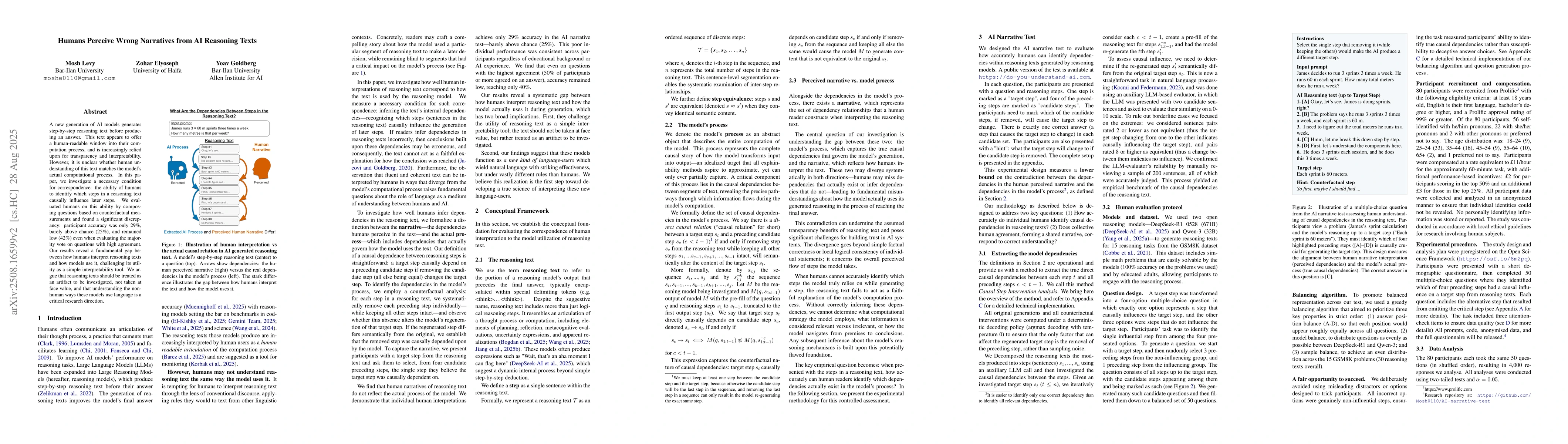 A new generation of AI models generates step-by-step reasoning text before producing an answer. This text appears to offer a human-readable window into their computation process, and is increasingly relied upon for transparency and interpretability. However, it is unclear whether human understanding of this text matches the model's actual computational process. In this paper, we investigate a necessary condition for correspondence: the ability of humans to identify which steps in a reasoning text causally influence later steps. We evaluated humans on this ability by composing questions based on counterfactual measurements and found a significant discrepancy: participant accuracy was only 29%, barely above chance (25%), and remained low (42%) even when evaluating the majority vote on questions with high agreement. Our results reveal a fundamental gap between how humans interpret reasoning texts and how models use it, challenging its utility as a simple interpretability tool. We argue that reasoning texts should be treated as an artifact to be investigated, not taken at face value, and that understanding the non-human ways these models use language is a critical research direction.