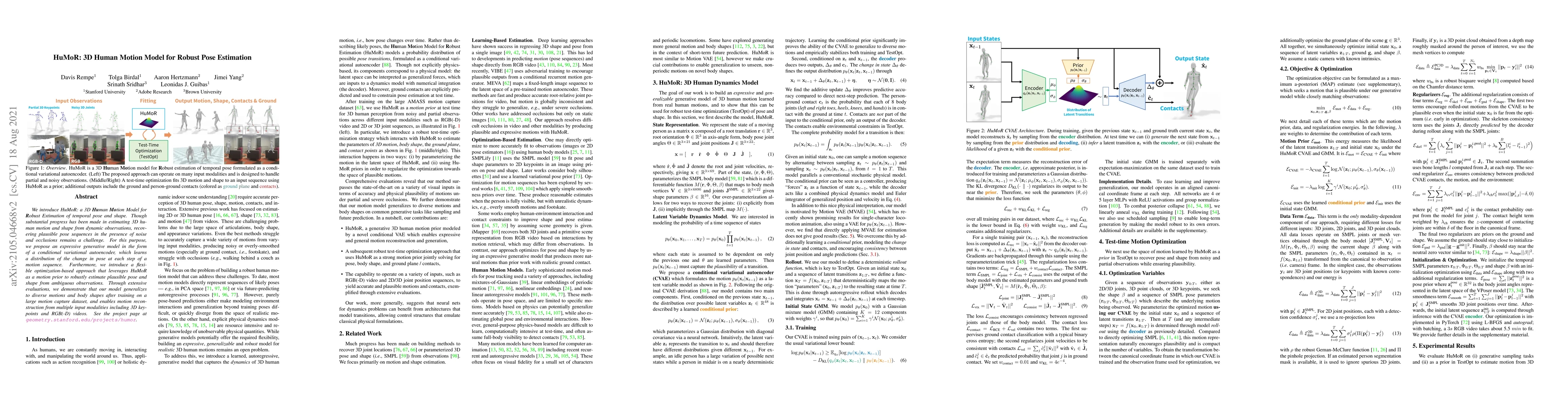 HuMoR is a generative 3D human motion model using a conditional variational autoencoder to estimate temporal pose and shape robustly. It effectively reconstructs plausible pose sequences even under noise and occlusions, leveraging a motion prior for robust pose estimation from diverse input modalities.
