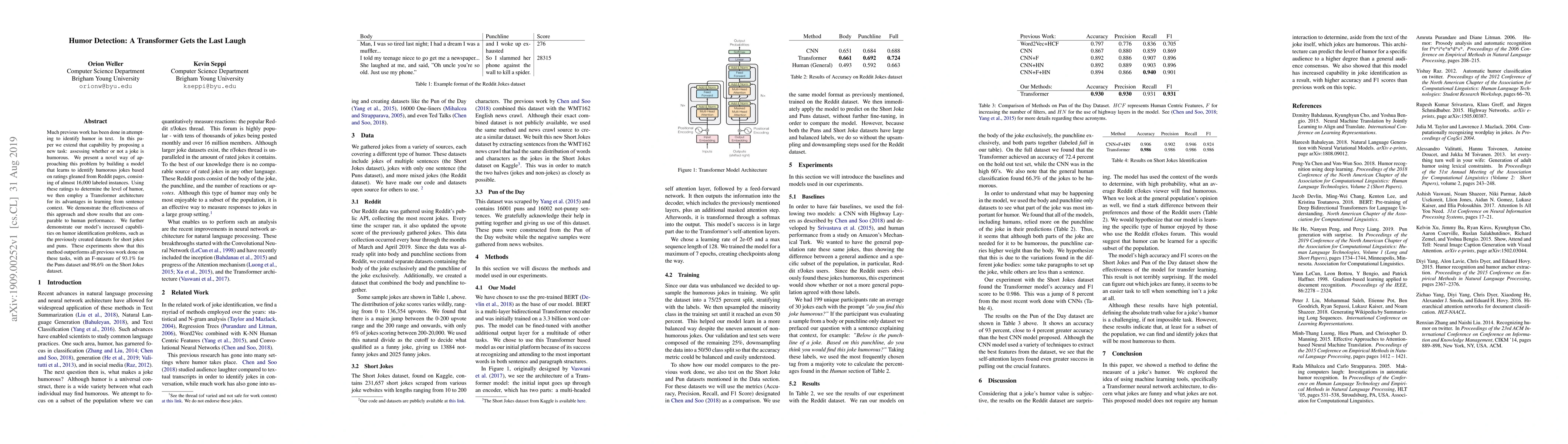 This paper introduces a Transformer-based model for detecting humor in jokes, trained on Reddit ratings of nearly 16,000 instances. The model achieves high performance, outperforming previous methods with an F-measure of 93.1% on the Puns dataset and 98.6% on the Short Jokes dataset.