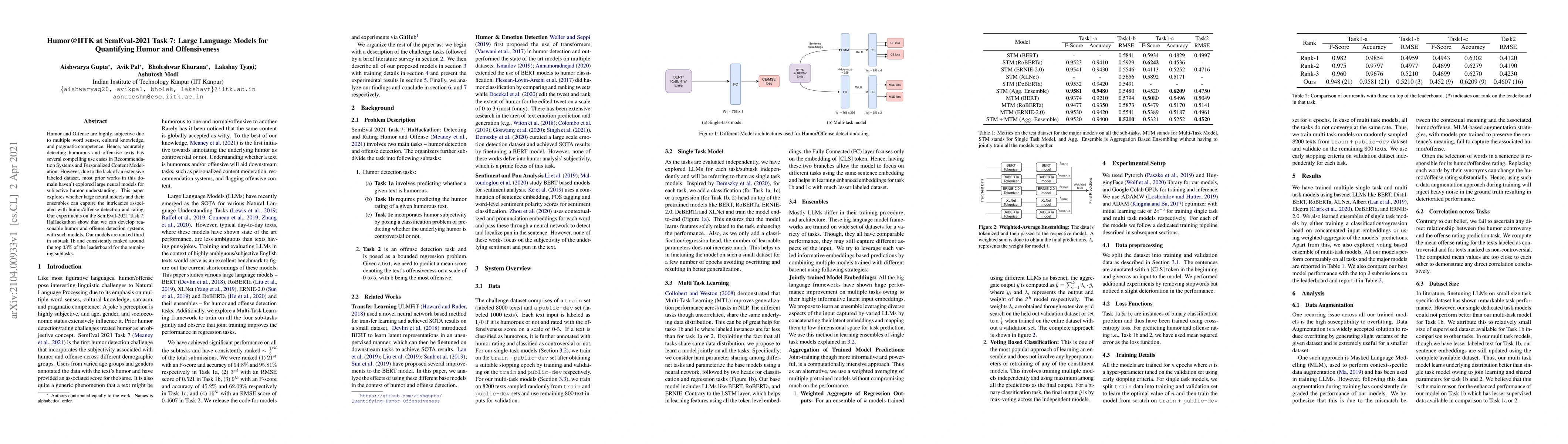 Humor and Offense are highly subjective due to multiple word senses, cultural knowledge, and pragmatic competence. Hence, accurately detecting humorous and offensive texts has several compelling use cases in Recommendation Systems and Personalized Content Moderation. However, due to the lack of an extensive labeled dataset, most prior works in this domain haven't explored large neural models for subjective humor understanding. This paper explores whether large neural models and their ensembles can capture the intricacies associated with humor/offense detection and rating. Our experiments on the SemEval-2021 Task 7: HaHackathon show that we can develop reasonable humor and offense detection systems with such models. Our models are ranked third in subtask 1b and consistently ranked around the top 33% of the leaderboard for the remaining subtasks.