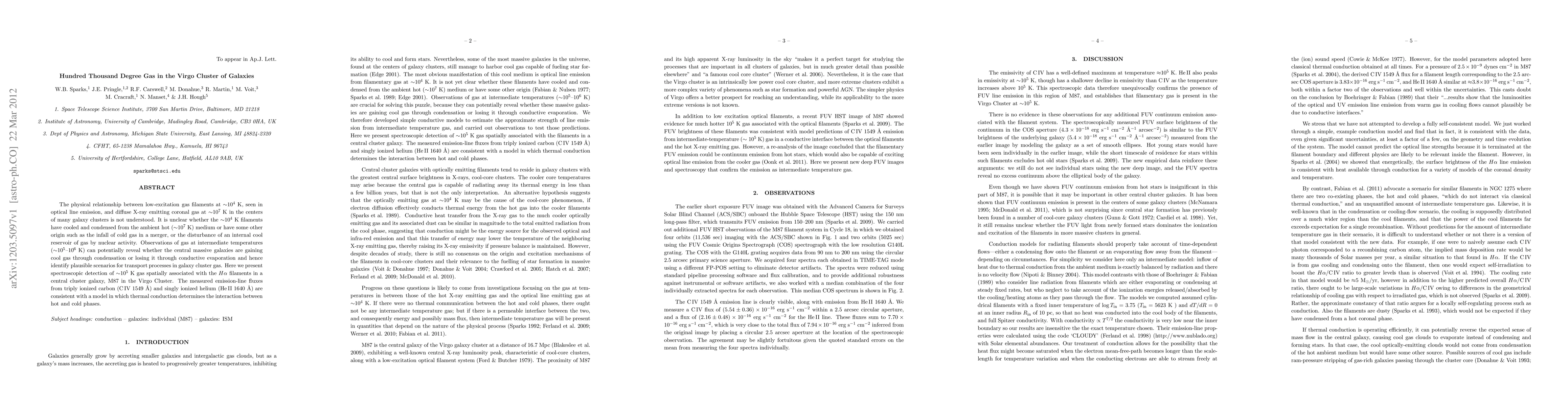 The physical relationship between low-excitation gas filaments at ~10^4 K, seen in optical line emission, and diffuse X-ray emitting coronal gas at ~10^7 K in the centers of many galaxy clusters is not understood. It is unclear whether the ~10^4 K filaments have cooled and condensed from the ambient hot (~10^7 K) medium or have some other origin such as the infall of cold gas in a merger, or the disturbance of an internal cool reservoir of gas by nuclear activity. Observations of gas at intermediate temperatures (~10^5-10^6 K) can potentially reveal whether the central massive galaxies are gaining cool gas through condensation or losing it through conductive evaporation and hence identify plausible scenarios for transport processes in galaxy cluster gas. Here we present spectroscopic detection of ~10^5 K gas spatially associated with the H-alpha filaments in a central cluster galaxy, M87 in the Virgo Cluster. The measured emission-line fluxes from triply ionized carbon (CIV 1549 A) and singly ionized helium (HeII 1640 A) are consistent with a model in which thermal conduction determines the interaction between hot and cold phases.