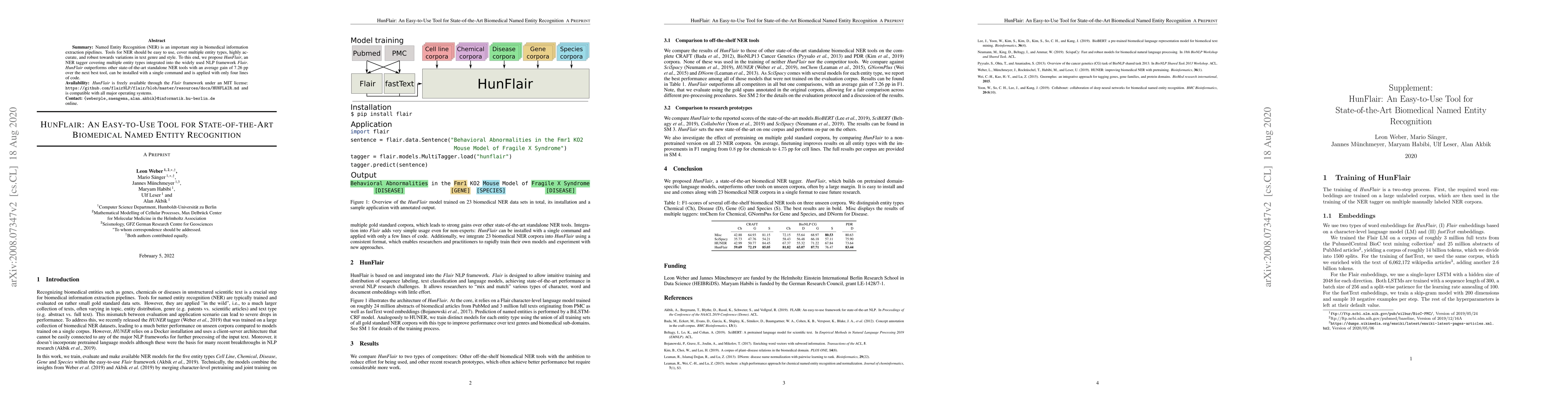Summary: HunFlair is a user-friendly biomedical Named Entity Recognition (NER) tool integrated into the Flair NLP framework, achieving superior accuracy and ease of use compared to other NER tools, and is freely available under an MIT license.