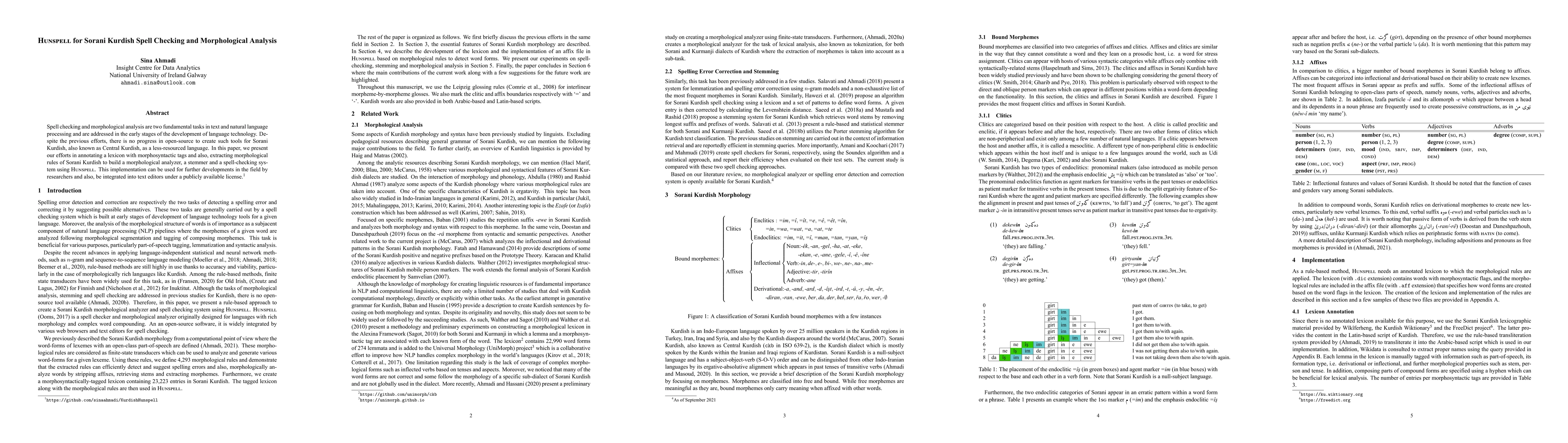 The research presents an effort to annotate a lexicon with morphosyntactic tags and extract morphological rules for Sorani Kurdish, implementing a morphological analyzer, stemmer, and spell-checking system using Hunspell.