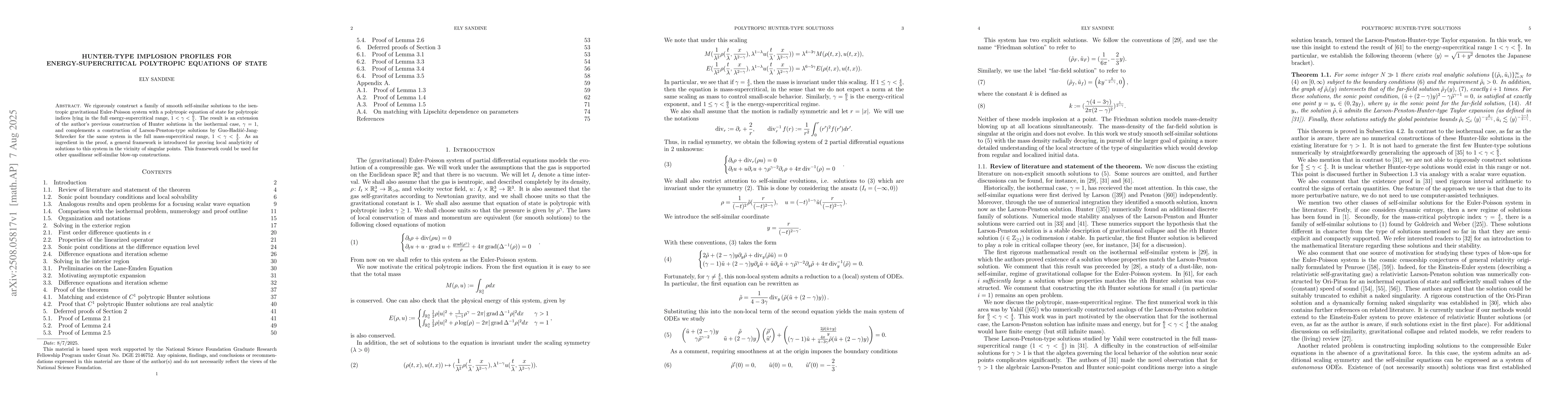 We rigorously construct a family of smooth self-similar solutions to the isentropic gravitational Euler-Poisson system with a polytropic equation of state for polytropic indices lying in the full energy-supercritical range, $1<\gamma<\frac{6}{5}$. The result is an extension of the author's previous construction of Hunter solutions in the isothermal case, $\gamma=1$, and complements a construction of Larson-Penston-type solutions by Guo-Had\v{z}i\'c-Jang-Schrecker for the same system in the full mass-supercritical range, $1<\gamma<\frac{4}{3}$. As an ingredient in the proof, a general framework is introduced for proving local analyticity of solutions to this system in the vicinity of singular points. This framework could be used for other quasilinear self-similar blow-up constructions.