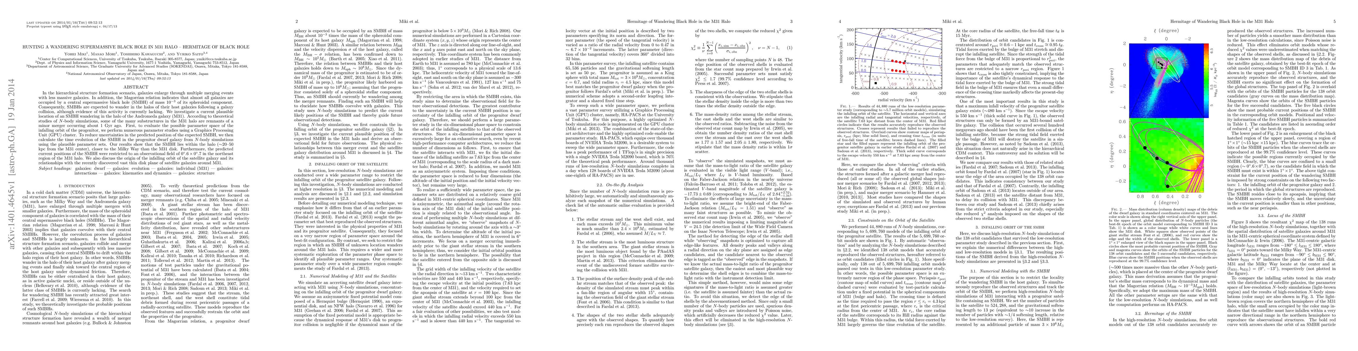 In the hierarchical structure formation scenario, galaxies enlarge through multiple merging events with less massive galaxies. In addition, the Magorrian relation indicates that almost all galaxies are occupied by a central supermassive black hole (SMBH) of mass $10^{-3}$ of its spheroidal component. Consequently, SMBHs are expected to wander in the halos of their host galaxies following a galaxy collision, although evidence of this activity is currently lacking. We investigate a current plausible location of an SMBH wandering in the halo of the Andromeda galaxy (M31). According to theoretical studies of $N$-body simulations, some of the many substructures in the M31 halo are remnants of a minor merger occurring about 1 Gyr ago. First, to evaluate the possible parameter space of the infalling orbit of the progenitor, we perform numerous parameter studies using a Graphics Processing Unit (GPU) cluster. To reduce uncertainties in the predicted position of the expected SMBH, we then calculate the time evolution of the SMBH in the progenitor dwarf galaxy from $N$-body simulations using the plausible parameter sets. Our results show that the SMBH lies within the halo ($\sim$20--50 kpc from the M31 center), closer to the Milky Way than the M31 disk. Furthermore, the predicted current positions of the SMBH were restricted to an observational field of $0\degr.6 \times 0\degr.7$ in the northeast region of the M31 halo. We also discuss the origin of the infalling orbit of the satellite galaxy and its relationships with the recently discovered vast thin disk plane of satellite galaxies around M31.
