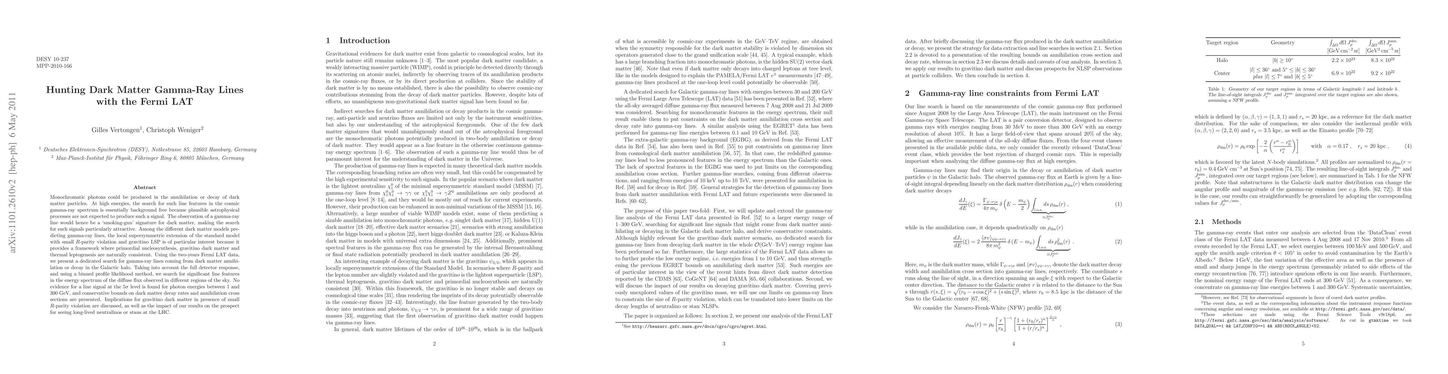 Monochromatic photons could be produced in the annihilation or decay of dark matter particles. At high energies, the search for such line features in the cosmic gamma-ray spectrum is essentially background free because plausible astrophysical processes are not expected to produce such a signal. The observation of a gamma-ray line would hence be a `smoking-gun' signature for dark matter, making the search for such signals particularly attractive. Among the different dark matter models predicting gamma-ray lines, the local supersymmetric extension of the standard model with small R-parity violation and gravitino LSP is of particular interest because it provides a framework where primordial nucleosynthesis, gravitino dark matter and thermal leptogenesis are naturally consistent. Using the two-years Fermi LAT data, we present a dedicated search for gamma-ray lines coming from dark matter annihilation or decay in the Galactic halo. Taking into account the full detector response, and using a binned profile likelihood method, we search for significant line features in the energy spectrum of the diffuse flux observed in different regions of the sky. No evidence for a line signal at the 5-sigma level is found for photon energies between 1 and 300 GeV, and conservative bounds on dark matter decay rates and annihilation cross sections are presented. Implications for gravitino dark matter in presence of small R-parity violation are discussed, as well as the impact of our results on the prospect for seeing long-lived neutralinos or staus at the LHC.