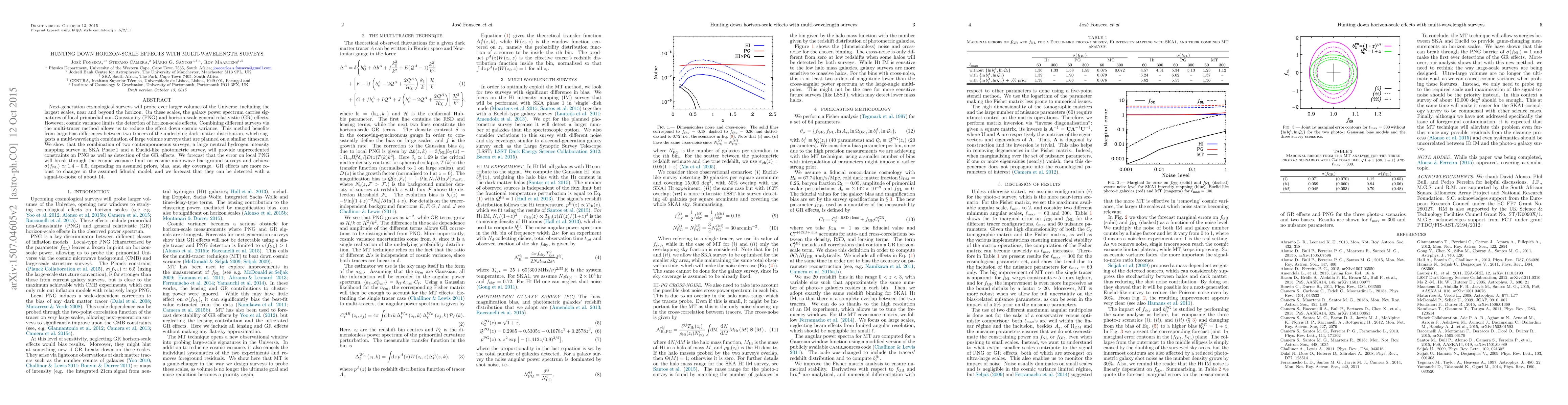 This paper explores the use of multi-wavelength surveys to detect horizon-scale effects in the universe, including signatures of primordial non-Gaussianity and general relativistic effects. It forecasts that combining a SKA Phase1 neutral hydrogen survey with a Euclid-like photometric survey will significantly reduce cosmic variance, achieving unprecedented constraints on non-Gaussianity and robust detection of general relativistic effects.