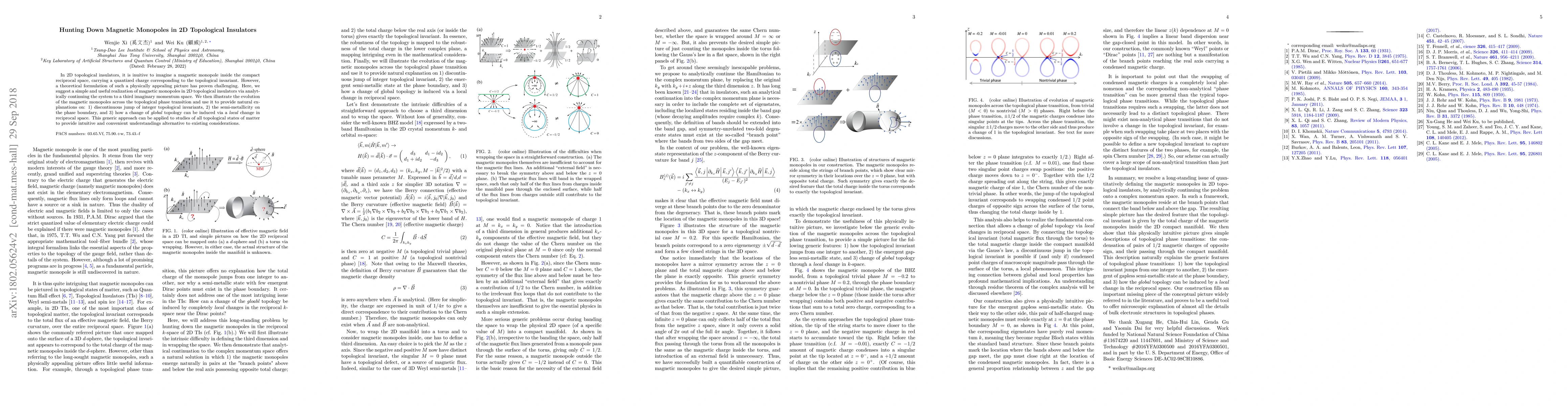 Contrary to the electric charge that generates the electric field, magnetic charge (namely magnetic monopoles) does not exist in the elementary electromagnetism. Consequently, magnetic flux lines only form loops and cannot have a source or a sink in nature. It is thus extraordinary to find that magnetic monopoles can be pictured conceptually in topological materials. Specifically in the 2D topological insulators, the topological invariant corresponds to the total flux of an effective magnetic field (the Berry curvature) over the reciprocal space.It is thus tempting to wrap the 2D reciprocal space into a compact manifold--a torus, and imagine the total flux to originate from magnetic monopoles inside the torus with a quantized total charge. However, such a physically appealing picture has not been realized quantitatively: other than their existence in a toy (actually misleading) picture, the properties of the magnetic monopoles remain unknown. Here, we will address this long-standing problem by hunting down the magnetic monopoles in the reciprocal $k$-space. We will show that a simple and physically useful picture will arrive upon analytically continuing the system to a third imaginary momentum space. We then illustrate the evolution of the magnetic monopoles across the topological phase transition and use it to provide natural explanations on: 1) discontinuous jump of integer topological invariants, 2) the semi-metallic nature on the phase boundary, and 3) how a change of global topology can be induced via a local change in reciprocal space.
