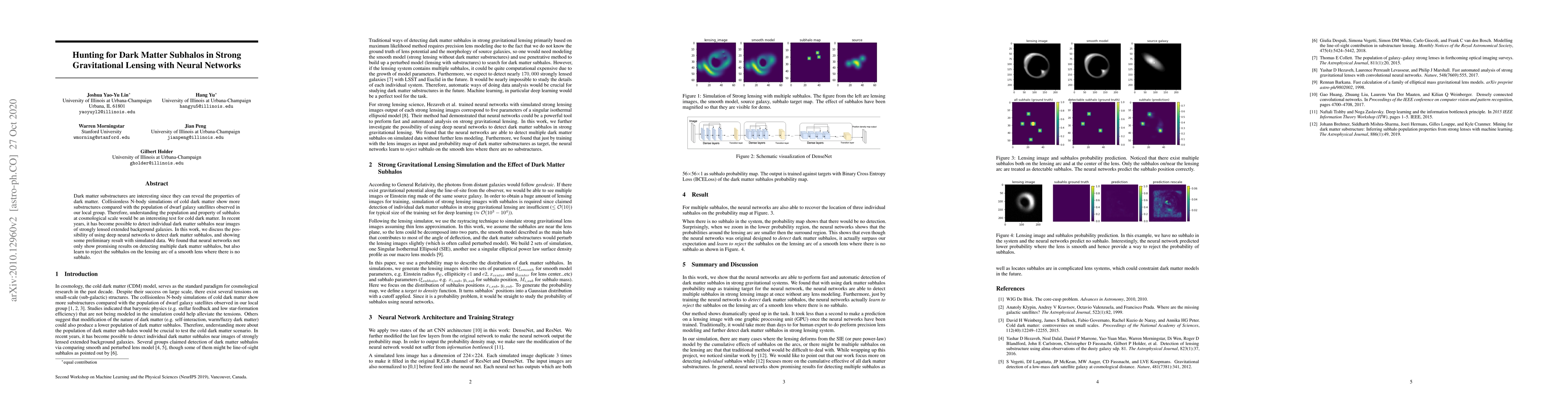This paper explores the use of deep neural networks to detect dark matter subhalos in strong gravitational lensing events, demonstrating promising preliminary results with simulated data. The study highlights the potential of neural networks to identify subhalos and distinguish them from lensing artifacts.