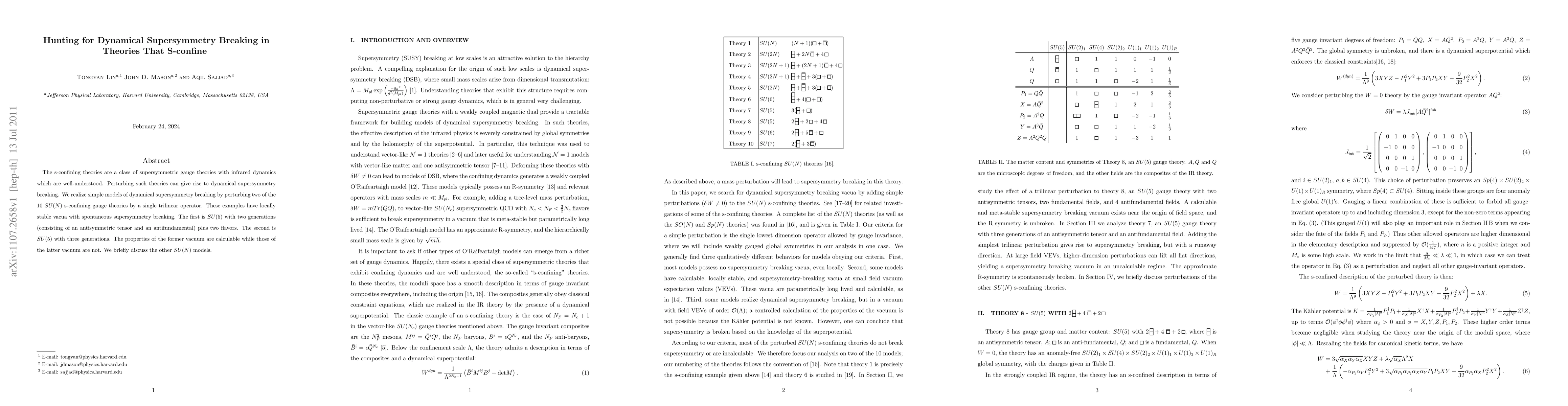This paper explores dynamical supersymmetry breaking in s-confining supersymmetric gauge theories by introducing a trilinear perturbation. Simple models of such breaking are realized in two SU(5) theories, one with two generations and the other with three, demonstrating spontaneous supersymmetry breaking in locally stable vacua.