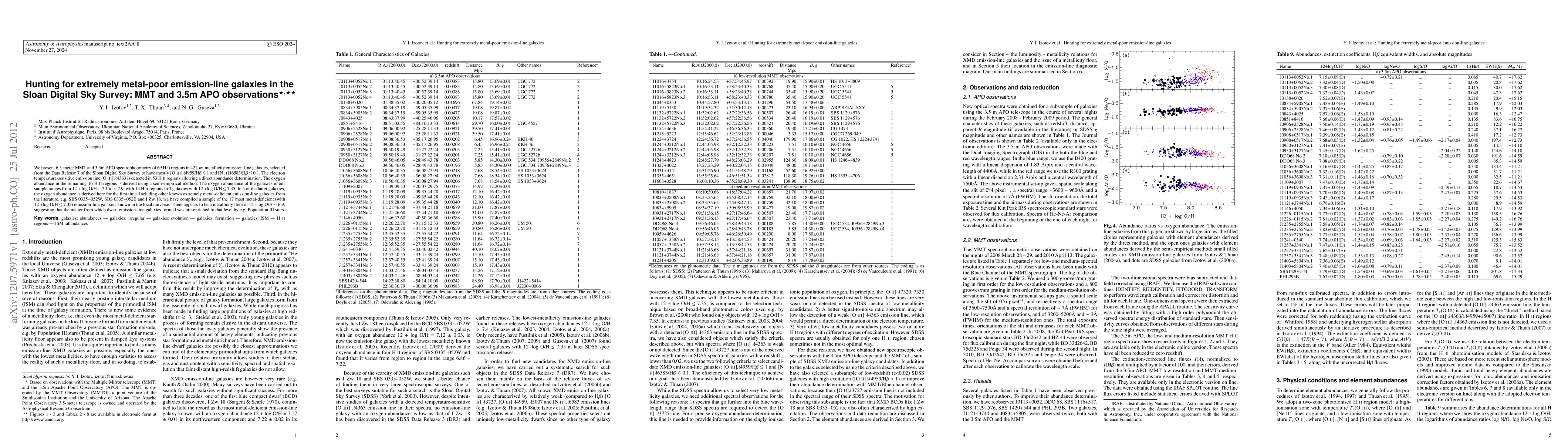 This study uses MMT and APO observations to analyze 69 H II regions in 42 low-metallicity emission-line galaxies from the Sloan Digital Sky Survey, identifying the 17 most metal-deficient galaxies with oxygen abundances below 12 + log O/H ~ 7.35, suggesting a metallicity floor at 12 +log O/H ~ 6.9.