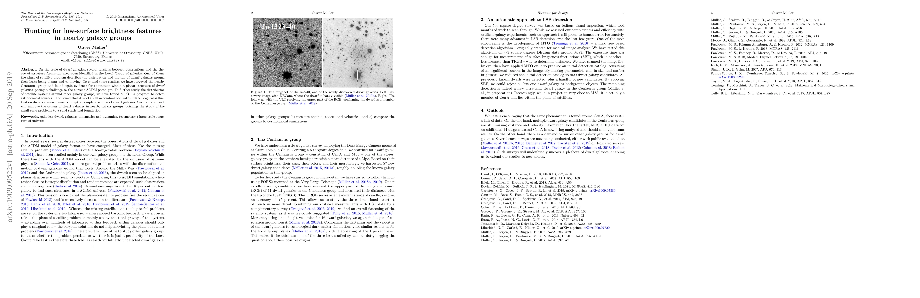 On the scale of dwarf galaxies, several tensions between observations and the theory of structure formation have been identified in the Local Group of galaxies. One of them, the plane-of-satellite problem describes the distribution and motion of dwarf galaxies around their hosts being planar and co-moving. To extend these studies, we have surveyed the nearby Centaurus group and found again evidence for co-rotation within a planar structure of dwarf galaxies, posing a challenge to the current LambdaCDM paradigm. To further study the distribution of satellite systems around other galaxy groups, we have tested MTO - a program to detect astronomical sources - and found that it works well in combination with surface brightness fluctuation distance measurements to get a complete sample of dwarf galaxies. Such an approach will improve the census of dwarf galaxies in nearby galaxy groups, bringing the study of the small-scale problems to a solid statistical foundation.