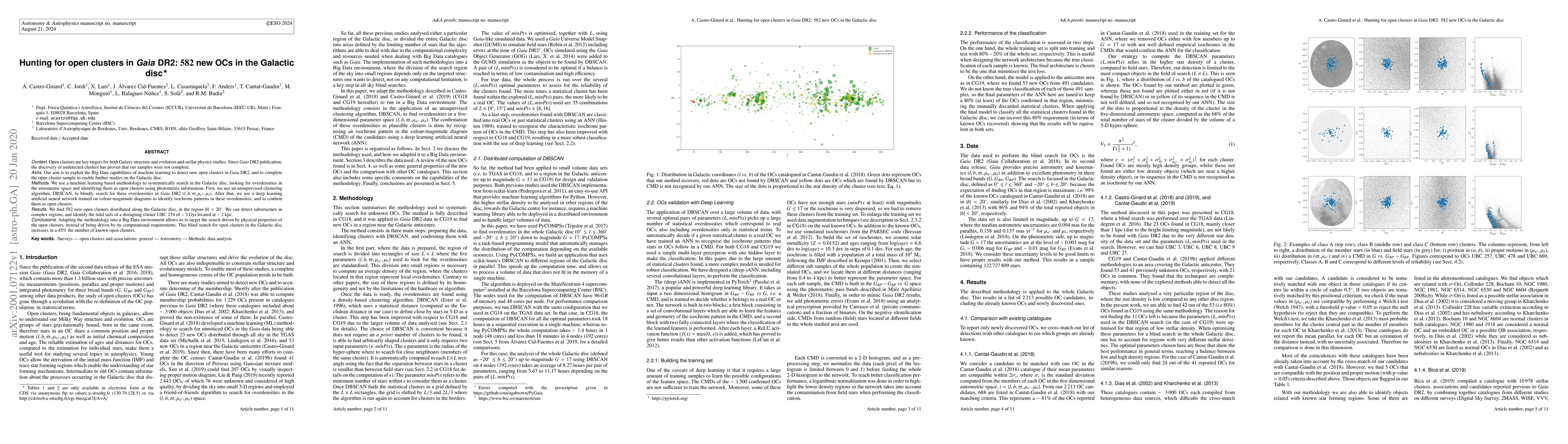 Open clusters are key targets for both Galaxy structure and evolution and stellar physics studies. Since \textit{Gaia} DR2 publication, the discovery of undetected clusters has proven that our samples were not complete. Our aim is to exploit the Big Data capabilities of machine learning to detect new open clusters in \textit{Gaia} DR2, and to complete the open cluster sample to enable further studies on the Galactic disc. We use a machine learning based methodology to systematically search in the Galactic disc, looking for overdensities in the astrometric space and identifying them as open clusters using photometric information. First, we use an unsupervised clustering algorithm, DBSCAN, to blindly search for these overdensities in \textit{Gaia} DR2 $(l,b,\varpi,\mu_{\alpha^*},\mu_\delta)$. After that, we use a deep learning artificial neural network trained on colour-magnitude diagrams to identify isochrone patterns in these overdensities, and to confirm them as open clusters. We find $582$ new open clusters distributed along the Galactic disc, in the region $|b| < 20$. We can detect substructure in complex regions, and identify the tidal tails of a disrupting cluster UBC~$274$ of $\sim 3$ Gyr located at $\sim 2$ kpc. Adapting the methodology into a Big Data environment allows us to target the search driven by physical properties of the open clusters, instead of being driven by its computational requirements. This blind search for open clusters in the Galactic disc increases in a $45\%$ the number of known open clusters.