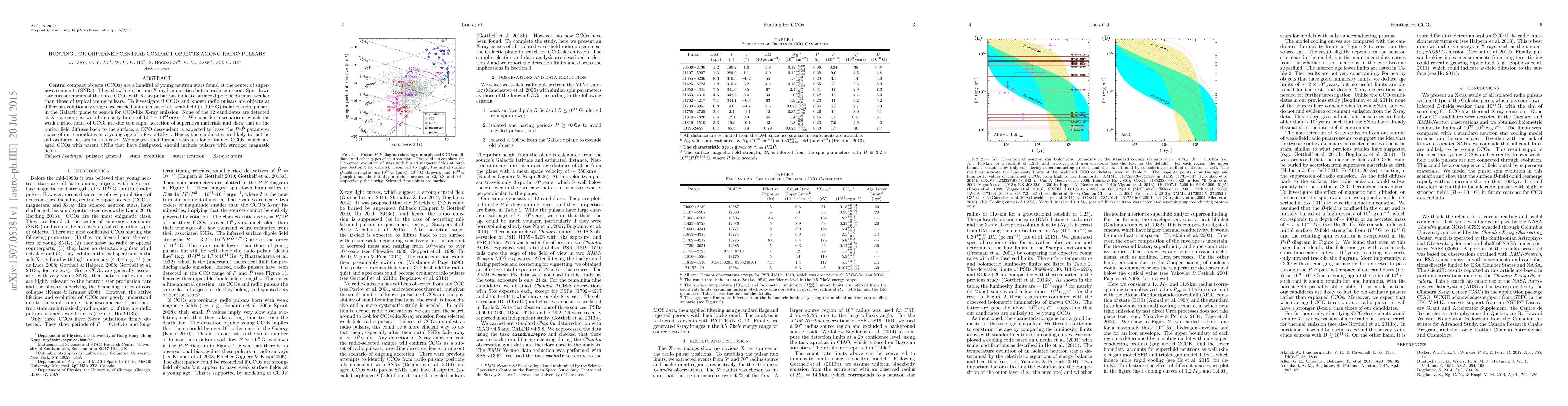 This paper investigates whether orphaned central compact objects (CCOs) could exist among weak-field radio pulsars by searching for CCO-like X-ray emissions. No X-ray emissions were detected in the 12 surveyed candidates, suggesting they are likely old ordinary pulsars rather than CCOs. The study recommends future searches focus on pulsars with stronger magnetic fields.