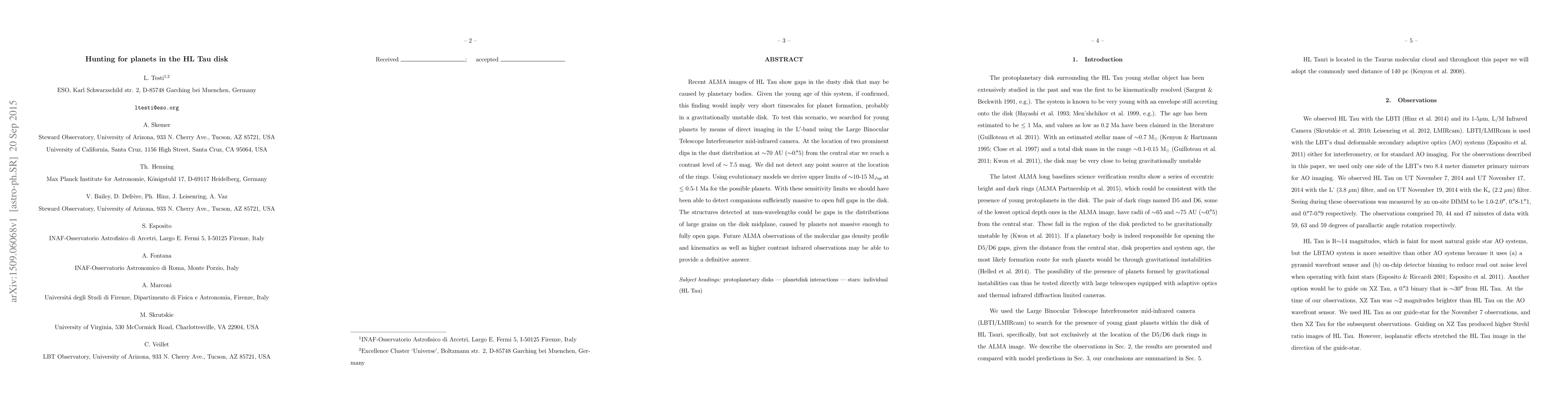 Recent ALMA images of HL Tau show gaps in the dusty disk that may be caused by planetary bodies. Given the young age of this system, if confirmed, this finding would imply very short timescales for planet formation, probably in a gravitationally unstable disk. To test this scenario, we searched for young planets by means of direct imaging in the L'-band using the Large Binocular Telescope Interferometer mid-infrared camera. At the location of two prominent dips in the dust distribution at ~70AU (~0.5") from the central star we reach a contrast level of ~7.5mag. We did not detect any point source at the location of the rings. Using evolutionary models we derive upper limits of ~10-15MJup at <=0.5-1Ma for the possible planets. With these sensitivity limits we should have been able to detect companions sufficiently massive to open full gaps in the disk. The structures detected at mm-wavelengths could be gaps in the distributions of large grains on the disk midplane, caused by planets not massive enough to fully open gaps. Future ALMA observations of the molecular gas density profile and kinematics as well as higher contrast infrared observations may be able to provide a definitive answer.