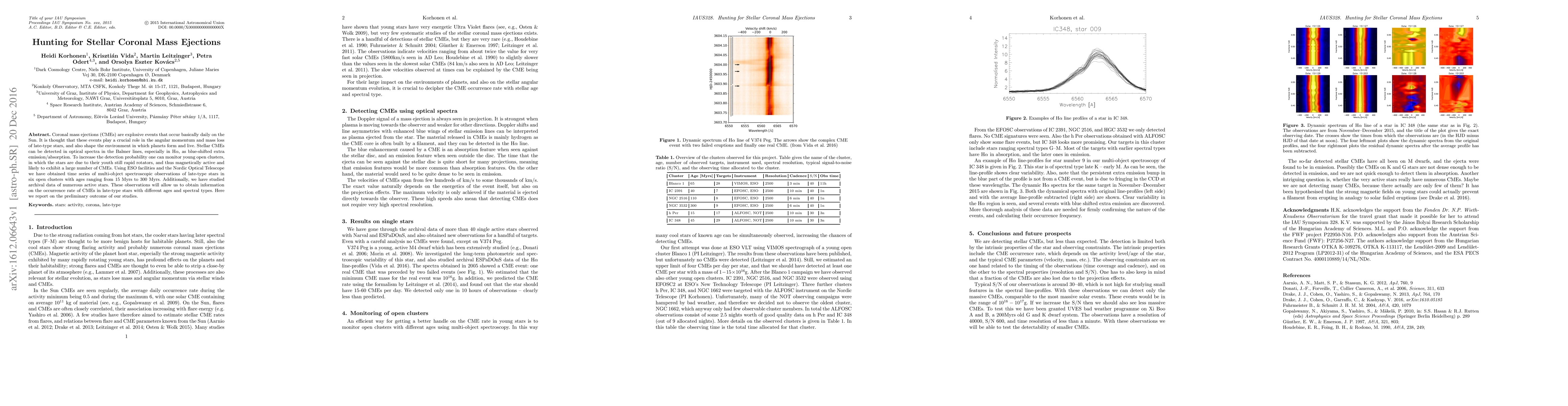 Coronal mass ejections (CMEs) are explosive events that occur basically daily on the Sun. It is thought that these events play a crucial role in the angular momentum and mass loss of late-type stars, and also shape the environment in which planets form and live. Stellar CMEs can be detected in optical spectra in the Balmer lines, especially in Halpha, as blue-shifted extra emission/absorption. To increase the detection probability one can monitor young open clusters, in which the stars are due to their youth still rapid rotators, and thus magnetically active and likely to exhibit a large number of CMEs. Using ESO facilities and the Nordic Optical Telescope we have obtained time series of multi-object spectroscopic observations of late-type stars in six open clusters with ages ranging from 15 Myrs to 300 Myrs. Additionally, we have studied archival data of numerous active stars. These observations will allow us to obtain information on the occurrence rate of CMEs in late-type stars with different ages and spectral types. Here we report on the preliminary outcome of our studies.