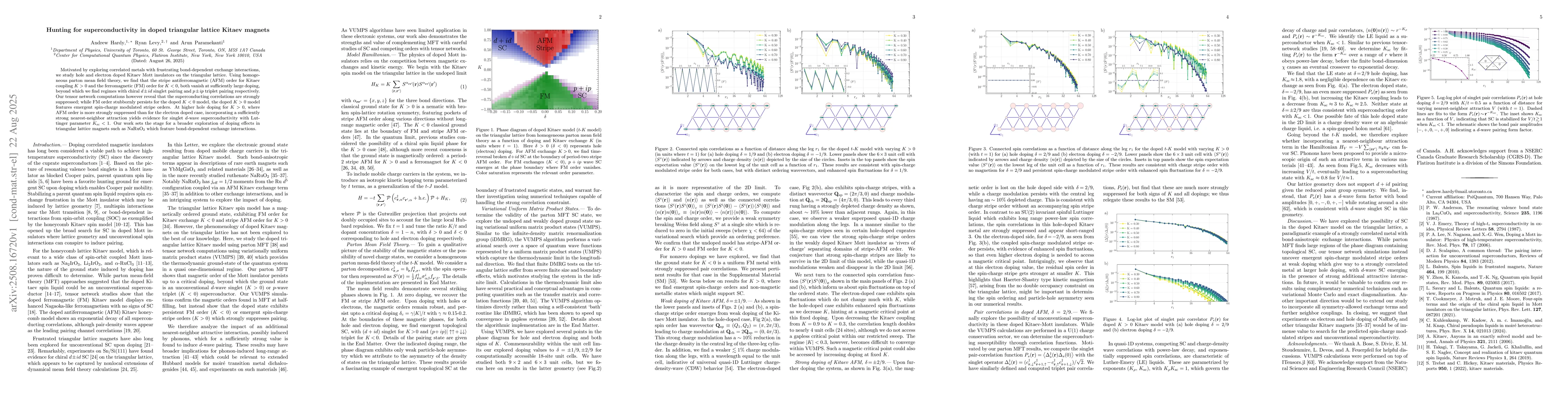 Motivated by exploring correlated metals with frustrating bond-dependent exchange interactions, we study hole and electron doped Kitaev Mott insulators on the triangular lattice. Using homogeneous parton mean field theory, we find that the stripe antiferromagnetic (AFM) order for Kitaev coupling $K>0$ and the ferromagnetic (FM) order for $K<0$, both vanish at sufficiently large doping, beyond which we find regimes with chiral $d\pm i d$ singlet pairing and $p\pm ip$ triplet pairing respectively. Our tensor network computations however reveal that the superconducting correlations are strongly suppressed; while FM order stubbornly persists for the doped $K<0$ model, the doped $K>0$ model features emergent spin-charge modulated stripe orders. At higher hole doping for $K > 0$, where AFM order is more strongly suppressed than for the electron doped case, incorporating a sufficiently strong nearest-neighbor attraction yields evidence for singlet $d$-wave superconductivity with Luttinger parameter $K_{\rm sc} < 1$. Our work sets the stage for a broader exploration of doping effects in triangular lattice magnets such as NaRuO$_2$ which feature bond-dependent exchange interactions.