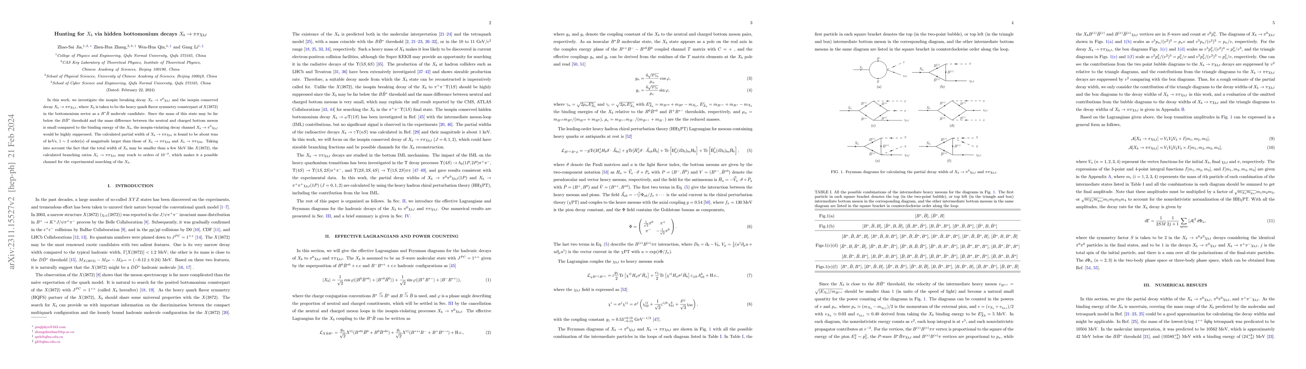 In this work, we investigate the isospin breaking decay $X_b \to \pi^0\chi_{bJ}$ and the isospin conserved decay $X_b \to \pi\pi\chi_{bJ}$, where $X_b$ is taken to be the heavy quark flavor symmetry counterpart of $X(3872)$ in the bottomonium sector as a $B^*\bar B$ molecule candidate. Since the mass of this state may be far below the $B {\bar B}^*$ threshold and the mass difference between the neutral and charged bottom meson is small compared to the binding energy of the $X_b$, the isospin-violating decay channel $X_b \to \pi^0 \chi_{bJ}$ would be highly suppressed. The calculated partial width of $X_b \to \pi\pi\chi_{b1}$ is found to be about tens of $\rm{keVs}$, $1\sim 2$ order(s) of magnitude larger than those of $X_b \to \pi\pi\chi_{b2}$ and $X_b \to \pi\pi\chi_{b0}$. Taking into account the fact that the total width of $X_b$ may be smaller than a few MeV like $X(3872)$, the calculated branching ratios $X_b\to \pi\pi \chi_{b1}$ may reach to orders of $10^{-2}$, which makes it a possible channel for the experimental searching of the $X_b$.