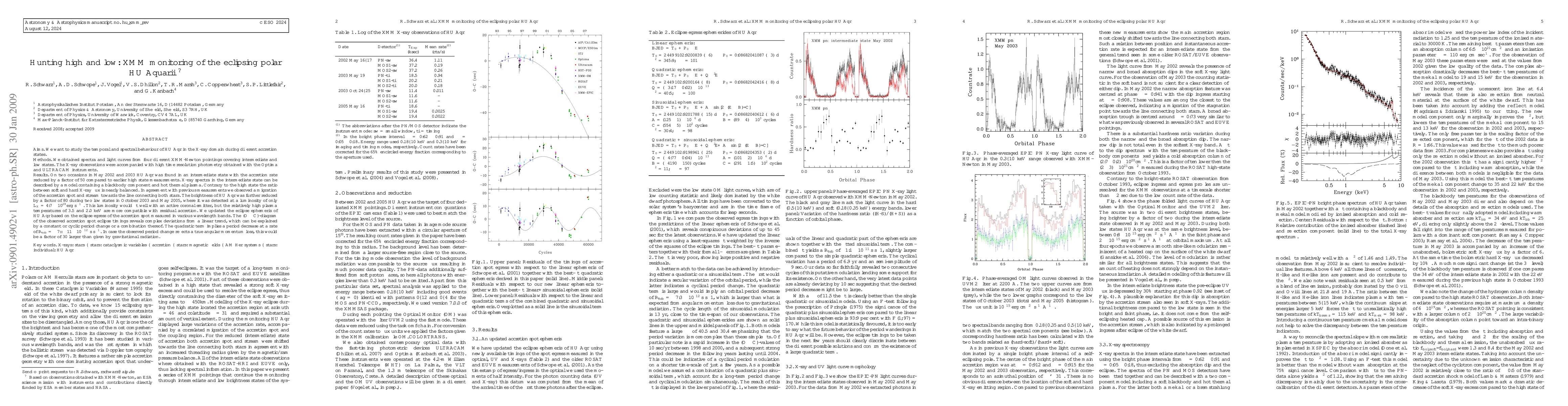 We want to study the temporal and spectral behaviour of HU Aqr in the X-ray domain during different accretion states. We obtained spectra and light curves from four different XMM-Newton pointings covering intermediate and low states. The X-ray observations were accompanied with high time resolution photometry obtained with the Optima and ULTRACAM instruments. On two occasions in May 2002 and 2003 HU Aqr was found in an intermediate state with the accretion rate reduced by a factor of 50 compared to earlier high state measurements. X-ray spectra in the intermediate state can be described by a model containing a blackbody component and hot thermal plasma. Contrary to the high state the ratio between soft and hard X-ray flux is nearly balanced. In agreement with previous measurements we observed a migration of the accretion spot and stream towards the line connecting both stars. The brightness of HU Aqr was further reduced by a factor of 80 during two low states in October 2003 and May 2005, where it was detected at a luminosity of only L_X = 4.7 * 10^(28) erg/sec . This luminosity would fit well with an active coronal emitter, but the relatively high plasma temperatures of 3.5 and 2.0 keV are more compatible with residual accretion. We updated the eclipse ephemeris of HU Aqr based on the eclipse egress of the accretion spot measured in various wavelength bands. The (O-C)-diagram of the observed accretion spot eclipse timings reveals complex deviations from a linear trend, which can be explained by a constant or cyclic period change or a combination thereof. The quadratic term implies a period decrease at a rate of \dot{P}_orb = -7..-11 * 10^(-12) sec/sec. In case the observed period change reflects a true angular momentum loss, this would be a factor of 30 larger than given by gravitational radiation.
