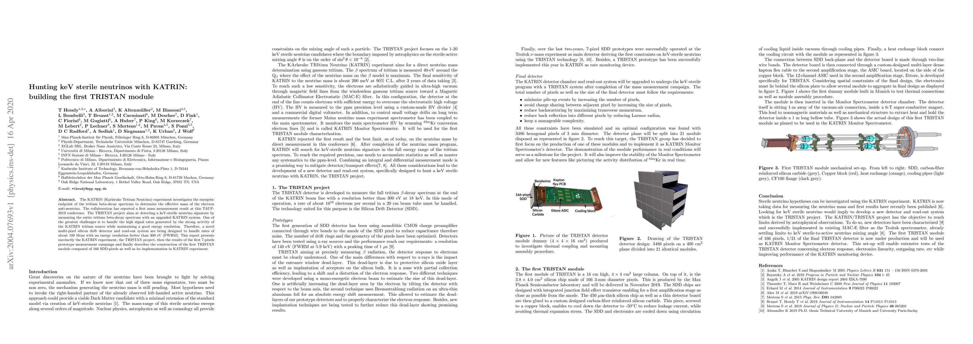 The KATRIN experiment aims to determine the electron neutrino's effective mass via tritium beta-decay, while the TRISTAN project seeks to detect keV sterile neutrinos using an upgraded KATRIN system. The first TRISTAN module, composed of 166 silicon drift detector pixels, has been constructed to manage high signal rates and maintain energy resolution.