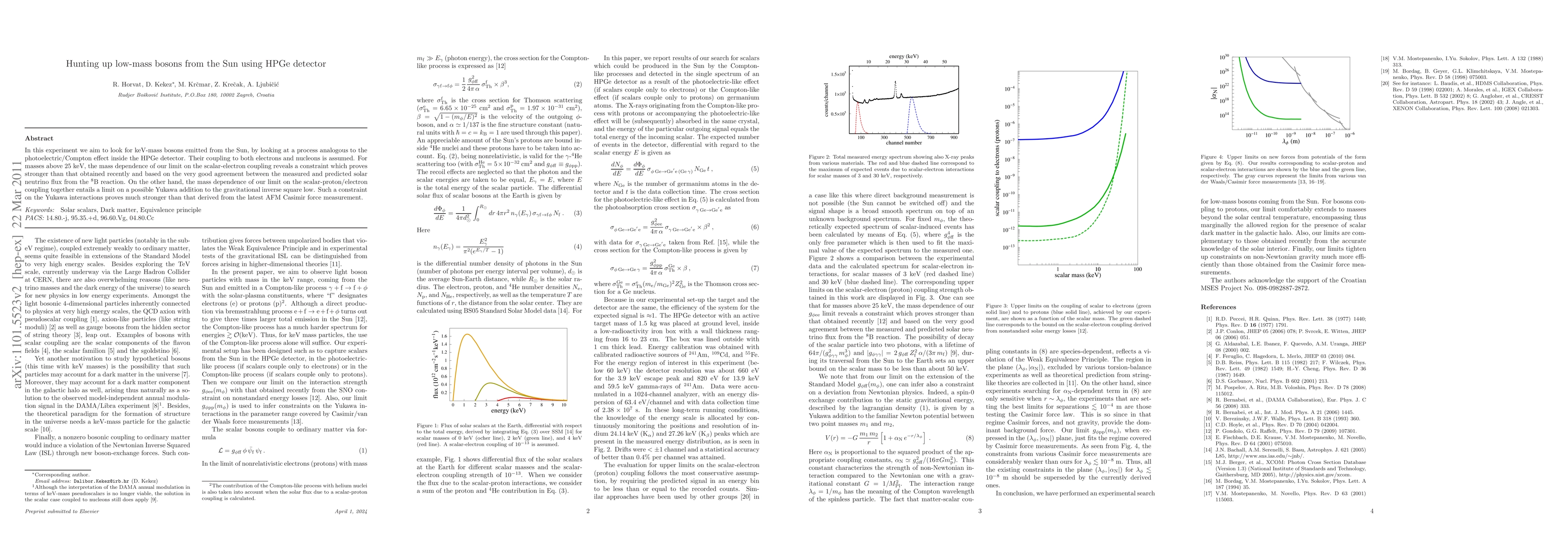 In this experiment we aim to look for keV-mass bosons emitted from the Sun, by looking at a process analogous to the photoelectric/Compton effect inside the HPGe detector. Their coupling to both electrons and nucleons is assumed. For masses above 25 keV, the mass dependence of our limit on the scalar-electron coupling reveals a constraint which proves stronger than that obtained recently and based on the very good agreement between the measured and predicted solar neutrino flux from the ^{8}B reaction. On the other hand, the mass dependence of our limit on the scalar-proton/electron coupling together entails a limit on a possible Yukawa addition to the gravitational inverse square low. Such a constraint on the Yukawa interactions proves much stronger than that derived from the latest AFM Casimir force measurement.