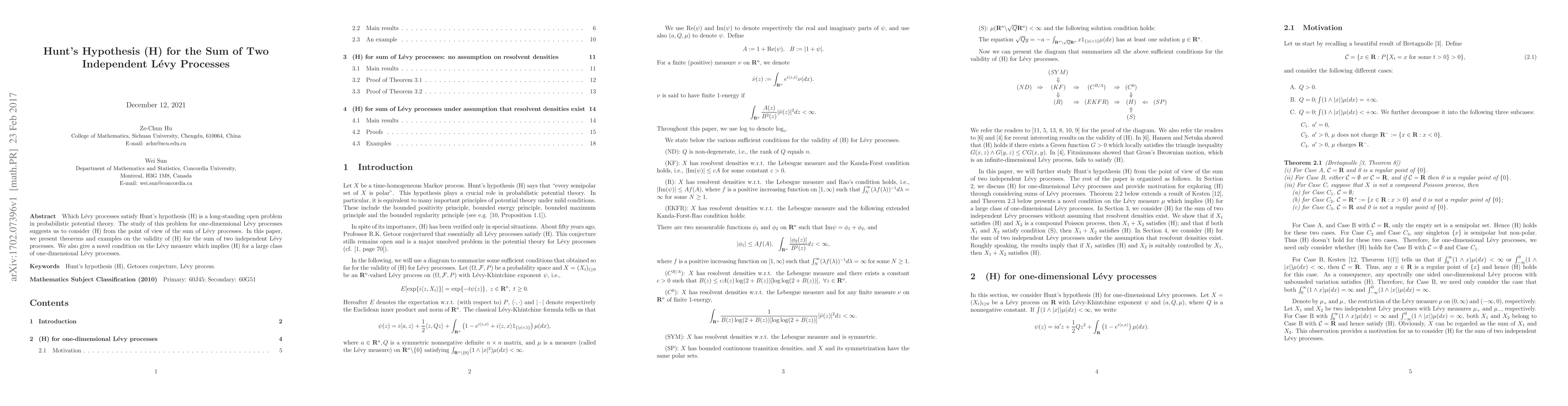 This research contributes to the long-standing open problem in probabilistic potential theory, providing insights into which Levy processes satisfy Hunt's Hypothesis (H) when considered as sums of Levy processes.
