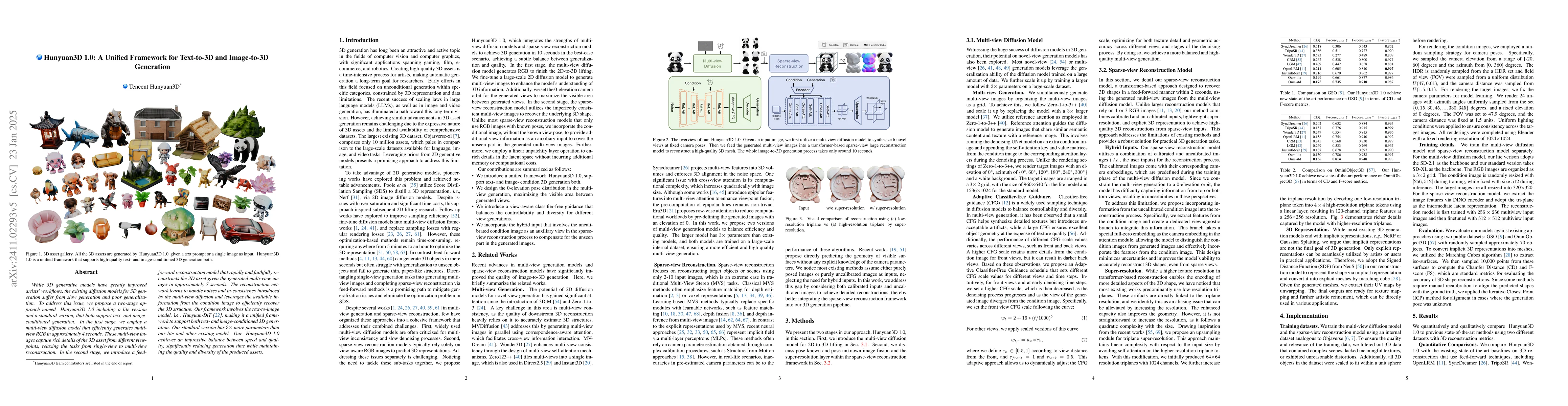 Hunyuan3D-1.0 is a unified framework that efficiently generates 3D assets from text or image inputs through a two-stage process: a fast multi-view diffusion model followed by a reconstruction network, achieving a balance between speed and quality. The framework notably reduces generation time while maintaining high asset quality and diversity.