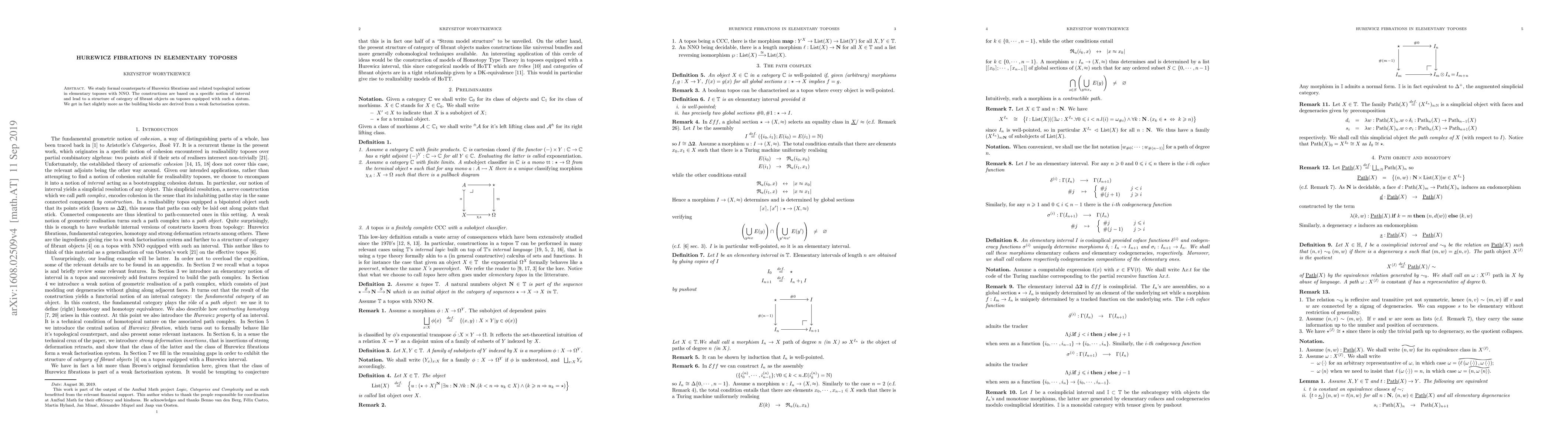 We study formal counterparts of Hurewicz fibrations and related topological notions in elementary toposes with NNO. The constructions are based on a specific notion of interval and lead to a structure of category of fibrant objects on toposes equipped with such a datum. We get in fact slightly more as the building blocks are derived from a weak factorisation system.