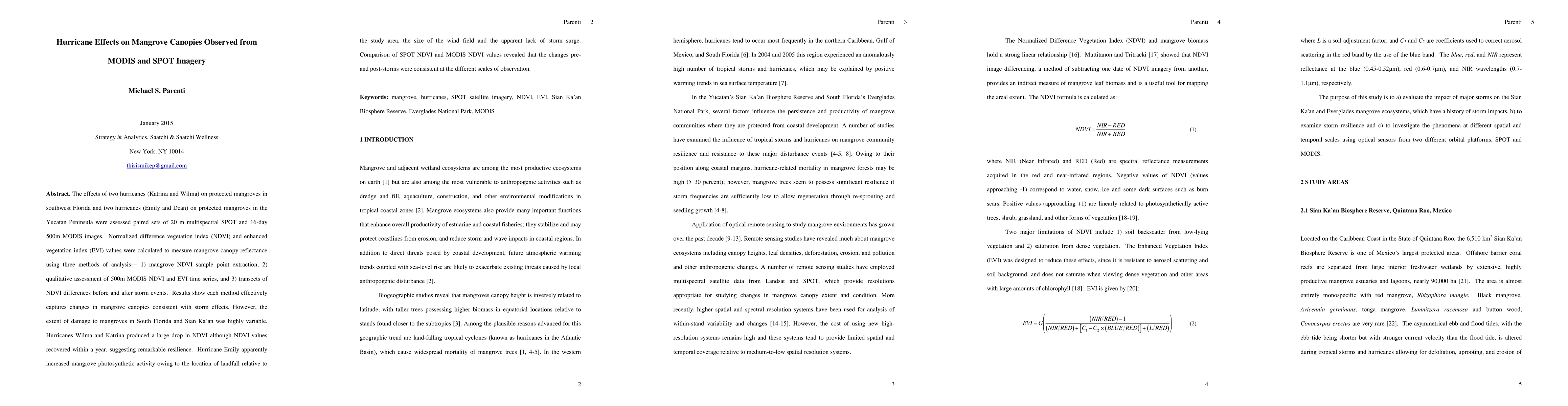 The effects of two hurricanes (Katrina and Wilma) on protected mangroves in southwest Florida and two hurricanes (Emily and Dean) on protected mangroves in the Yucatan Peninsula were assessed paired sets of 20m multispectral SPOT and 16-day 500m MODIS images. Normalized difference vegetation index (NDVI) and enhanced vegetation index (EVI) values were calculated to measure mangrove canopy reflectance using three methods of analysis- 1) mangrove NDVI sample point extraction, 2) qualitative assessment of 500m MODIS NDVI and EVI time series, and 3) transects of NDVI differences before and after storm events. Results show each method effectively captures changes in mangrove canopies consistent with storm effects. However, the extent of damage to mangroves in South Florida and Sian Ka'an was highly variable. Hurricanes Wilma and Katrina produced a large drop in NDVI although NDVI values recovered within a year, suggesting remarkable resilience. Hurricane Emily apparently increased mangrove photosynthetic activity owing to the location of landfall relative to the study area, the size of the wind field and the apparent lack of storm surge. Comparison of SPOT NDVI and MODIS NDVI values revealed that the changes pre- and post-storms were consistent at the different scales of observation.