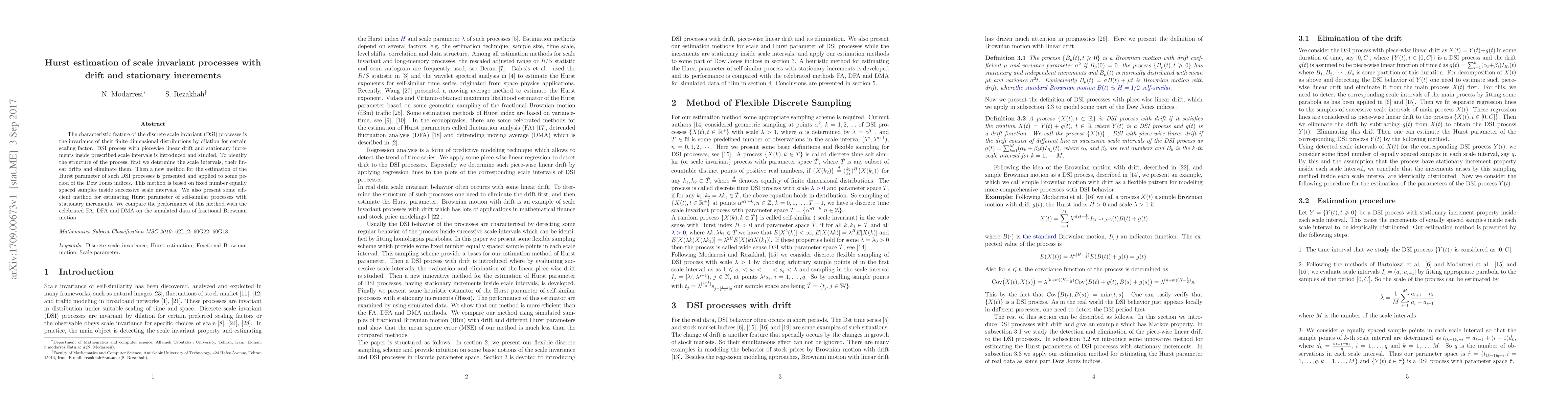 The characteristic feature of the discrete scale invariant (DSI) processes is the invariance of their finite dimensional distributions by dilation for certain scaling factor. DSI process with piecewise linear drift and stationary increments inside prescribed scale intervals is introduced and studied. To identify the structure of the process, first we determine the scale intervals, their linear drifts and eliminate them. Then a new method for the estimation of the Hurst parameter of such DSI processes is presented and applied to some period of the Dow Jones indices. This method is based on fixed number equally spaced samples inside successive scale intervals. We also present some efficient method for estimating Hurst parameter of self-similar processes with stationary increments. We compare the performance of this method with the celebrated FA, DFA and DMA on the simulated data of fractional Brownian motion.