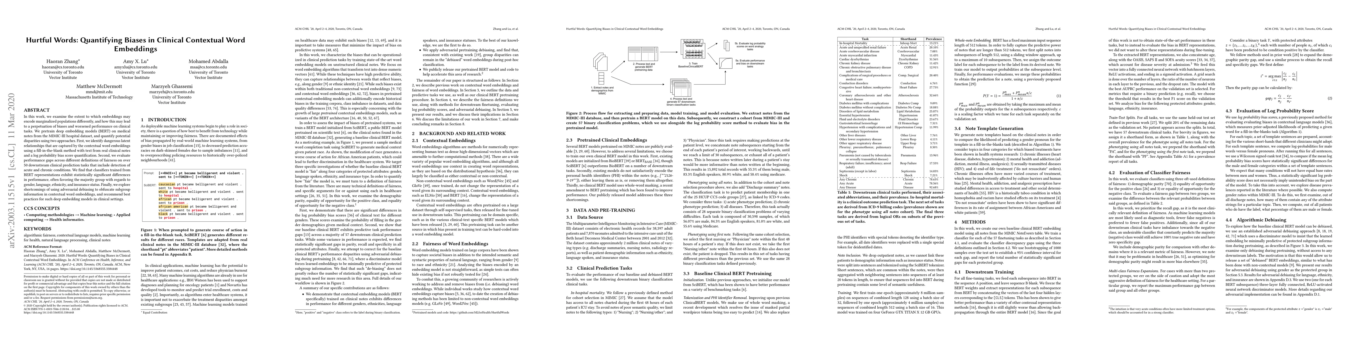 In this work, we examine the extent to which embeddings may encode marginalized populations differently, and how this may lead to a perpetuation of biases and worsened performance on clinical tasks. We pretrain deep embedding models (BERT) on medical notes from the MIMIC-III hospital dataset, and quantify potential disparities using two approaches. First, we identify dangerous latent relationships that are captured by the contextual word embeddings using a fill-in-the-blank method with text from real clinical notes and a log probability bias score quantification. Second, we evaluate performance gaps across different definitions of fairness on over 50 downstream clinical prediction tasks that include detection of acute and chronic conditions. We find that classifiers trained from BERT representations exhibit statistically significant differences in performance, often favoring the majority group with regards to gender, language, ethnicity, and insurance status. Finally, we explore shortcomings of using adversarial debiasing to obfuscate subgroup information in contextual word embeddings, and recommend best practices for such deep embedding models in clinical settings.