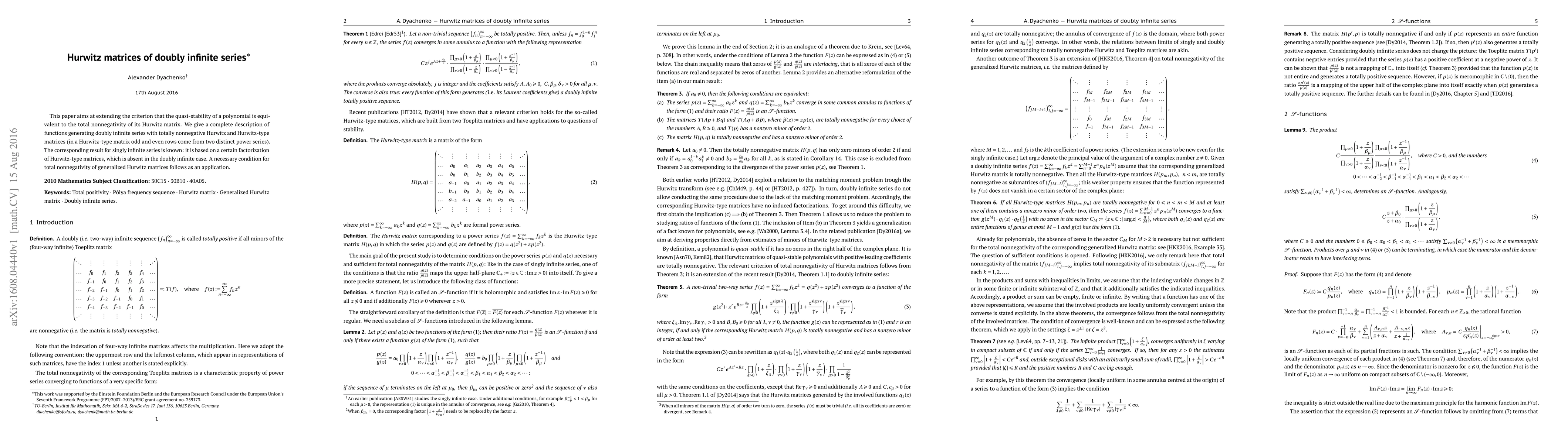 This paper aims at extending the criterion that the quasi-stability of a polynomial is equivalent to the total nonnegativity of its Hurwitz matrix. We give a complete description of functions generating doubly infinite series with totally nonnegative Hurwitz and Hurwitz-type matrices (in a Hurwitz-type matrix odd and even rows come from two distinct power series). The corresponding result for singly infinite series is known: it is based on a certain factorization of Hurwitz-type matrices, which is absent in the doubly infinite case. A necessary condition for total nonnegativity of generalized Hurwitz matrices follows as an application.
