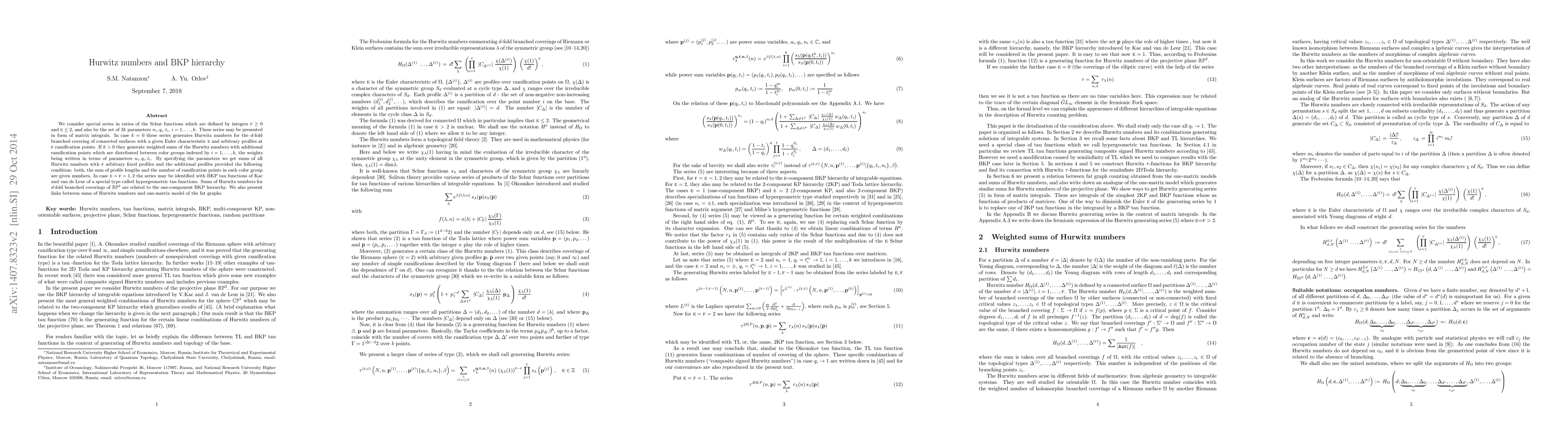 This paper explores special series in ratios of Schur functions generating Hurwitz numbers for branched coverings of surfaces, with additional ramification points distributed among color groups. It links these series to the BKP hierarchy and one-matrix models of fat graphs.