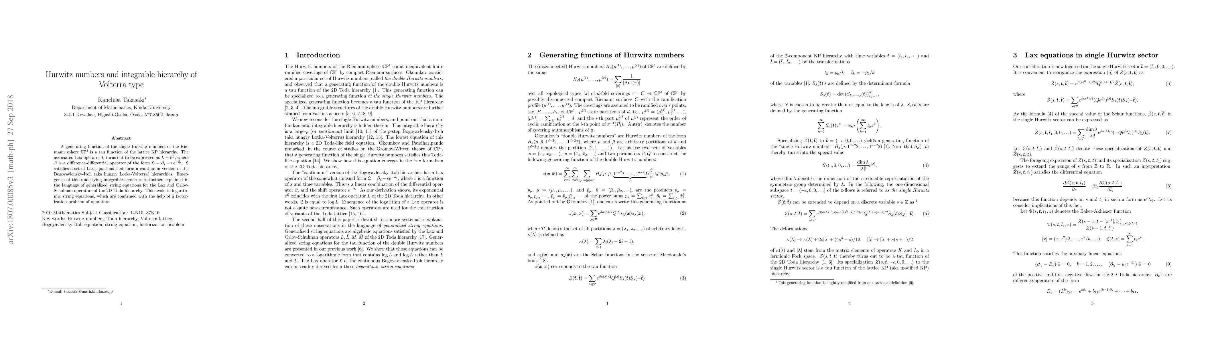 This paper explores the relationship between Hurwitz numbers and the integrable hierarchy of Volterra type, showing that the generating function of Hurwitz numbers corresponds to a tau function in the lattice KP hierarchy. The Lax operator is expressed as an exponential of a difference-differential operator, which forms a continuum version of the Bogoyavlensky-Itoh hierarchy, elucidated through generalized string equations and logarithmic string equations.