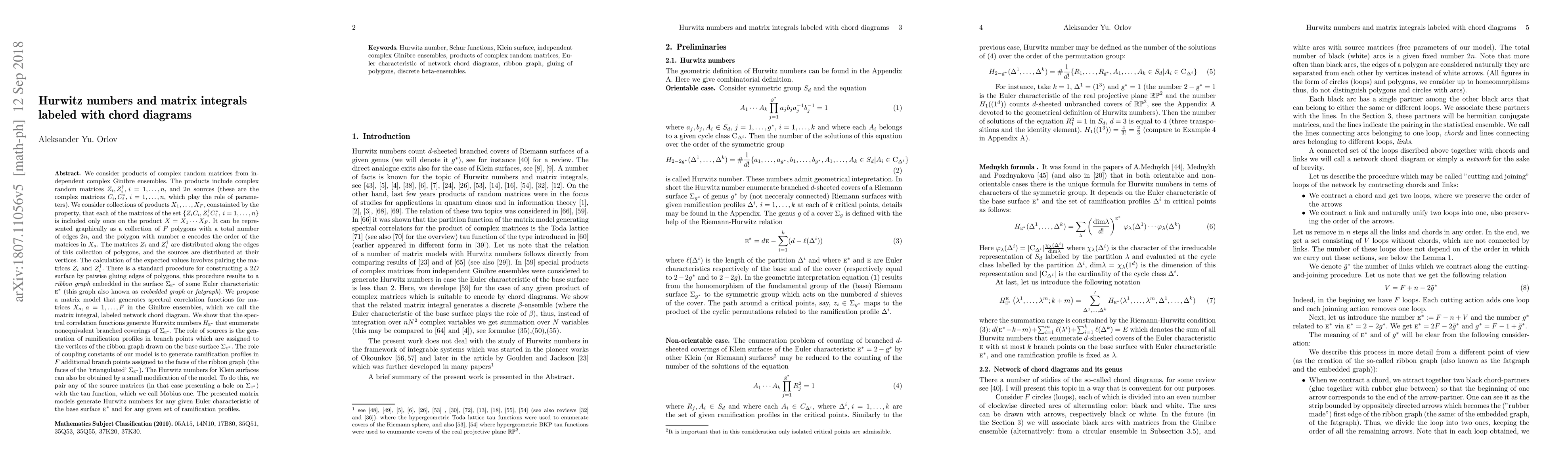 This paper explores matrix integrals from complex random matrix ensembles, represented by chord diagrams, and demonstrates their connection to Hurwitz numbers. It shows that the spectral correlation functions generate these numbers, which enumerate branched coverings of Riemann surfaces, with the role of sources generating branching profiles in critical points.