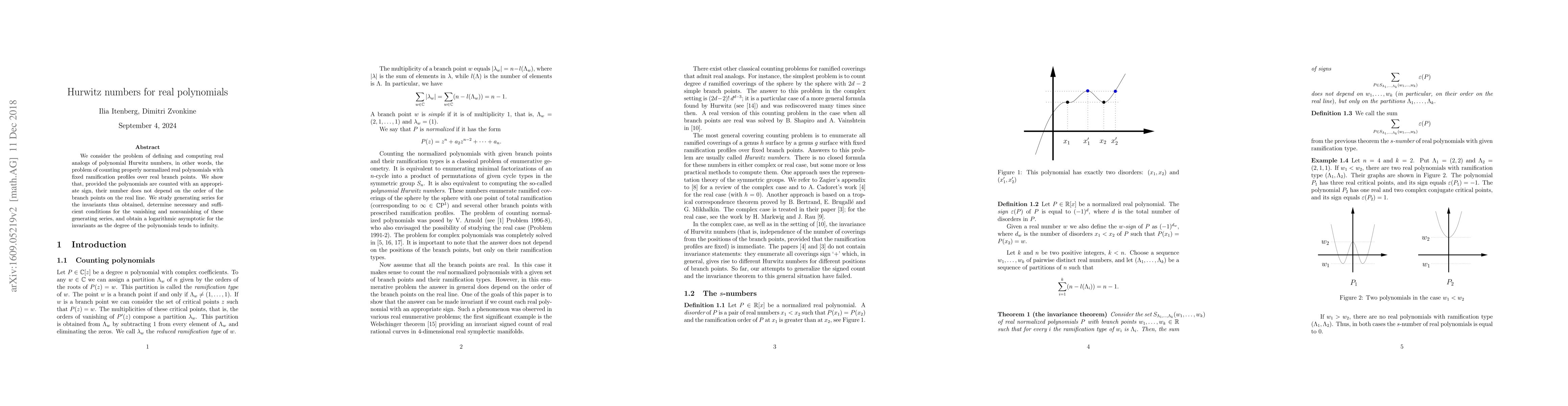 We consider the problem of defining and computing real analogs of polynomial Hurwitz numbers, in other words, the problem of counting properly normalized real polynomials with fixed ramification profiles over real branch points. We show that, provided the polynomials are counted with an appropriate sign, their number does not depend on the order of the branch points on the real line. We study generating series for the invariants thus obtained, determine necessary and sufficient conditions for the vanishing and nonvanishing of these generating series, and obtain a logarithmic asymptotic for the invariants as the degree of the polynomials tends to infinity.