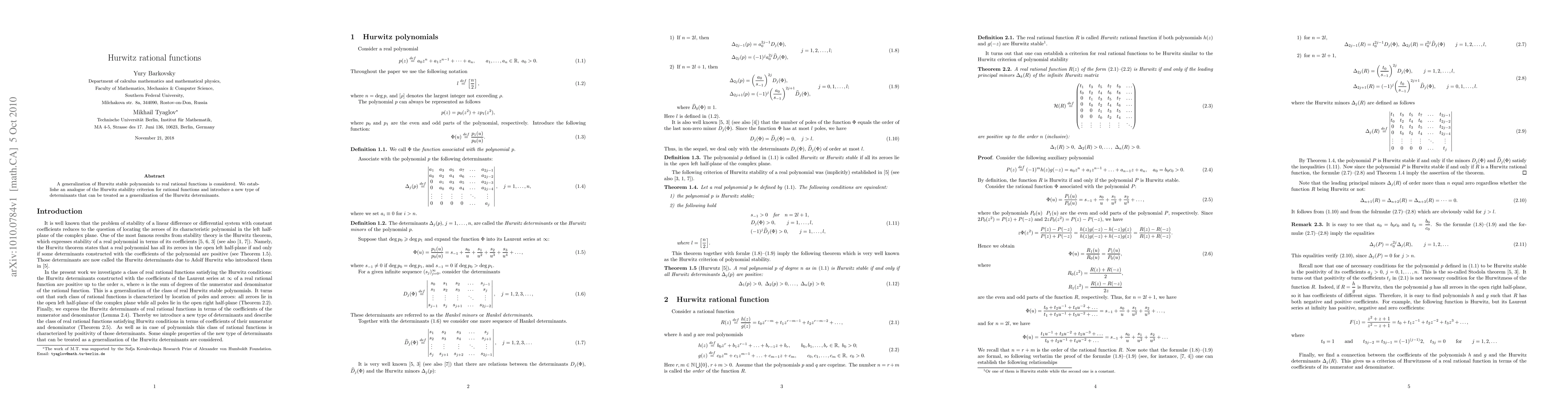 Summary: This paper generalizes Hurwitz stability from polynomials to real rational functions, presenting an analogous stability criterion and introducing new determinants that extend the concept of Hurwitz determinants.