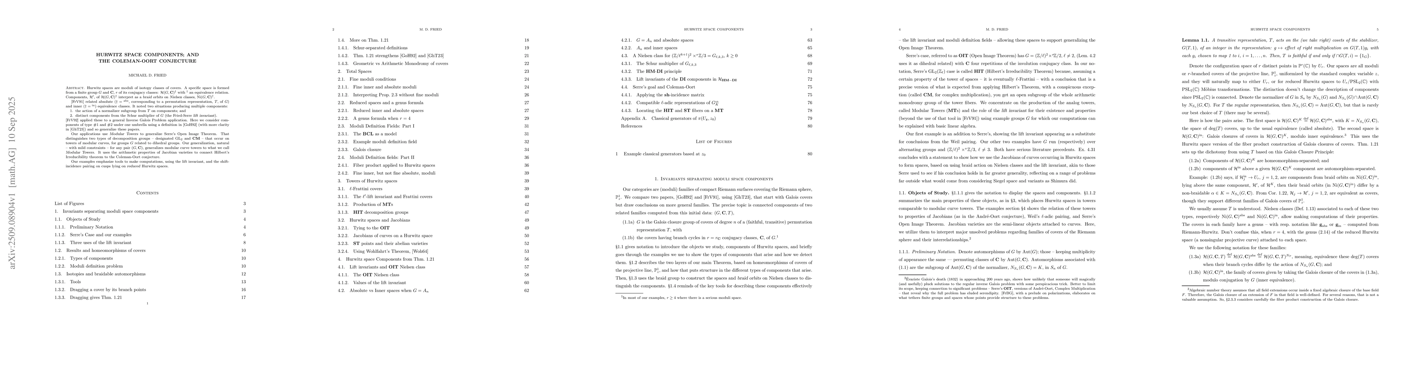 Hurwitz spaces are moduli of isotopy classes of covers. A specific space is formed from a finite group G and C, r of its conjugacy classes and an equivalence relation \dagger. Components, interpret as a braid orbits on Nielsen classes. Fried-V\"olklein 1991 related absolute (corresponding to a permutation representation, T, of G) and inner equivalence classes. It noted two situations producing multiple components: #1. The action of a normalizer subgroup from $T$ on components; and #2. distinct components from the Schur multiplier of $G$ (the Fried-Serre lift invariant). Here we consider components of type #1 and #2 under one umbrella using a definition in G.~Gonz\'alez-D\'iez and W.J. Harvey, 1992 to generalize this paper and A. Ghigi and C. Tamborini, 2025. Our applications use Modular Towers to generalize Serre's Open Image Theorem. That distinguishes two types of decomposition groups -- designated GL_2 and CM -- that occur on towers of modular curves. Our generalization -- with mild constraints -- for any pair (G,C), generalizes modular curve towers to Modular Towers uses arithmetic properties of Jacobian varieties, the lift invariant, the shift-incidence pairing on cusps of reduced Hurwitz spaces to connect Hilbert's Irreducibility theorem to the Coleman-Oort conjecture.