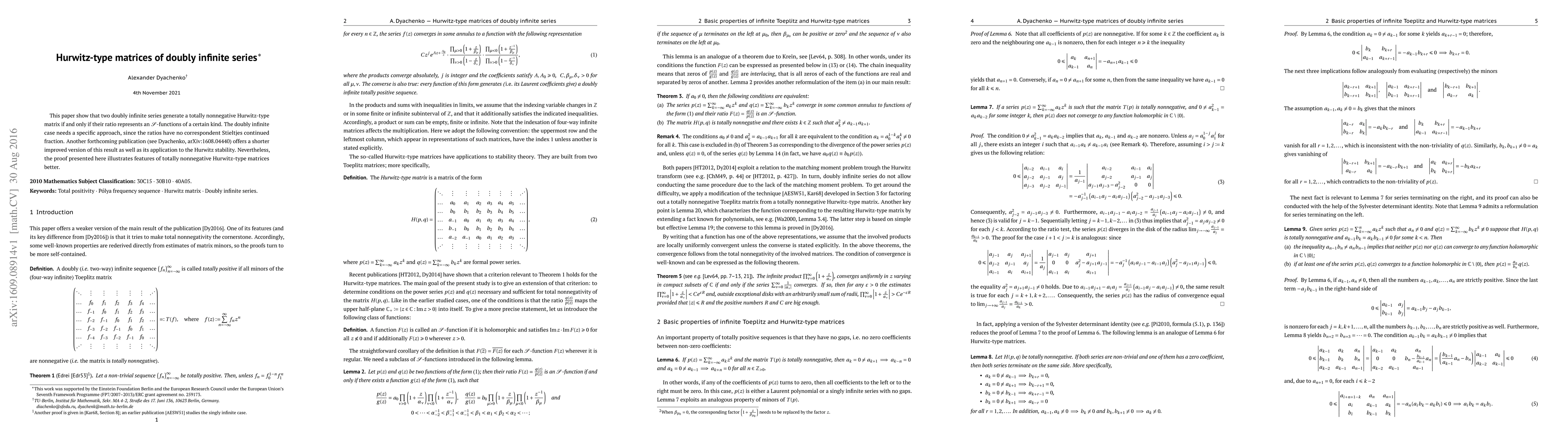 This paper establishes conditions under which two doubly infinite series generate a totally nonnegative Hurwitz-type matrix, showing equivalence to the ratio representing a specific kind of S-function, with an alternative forthcoming publication offering a more concise result and application to Hurwitz stability.