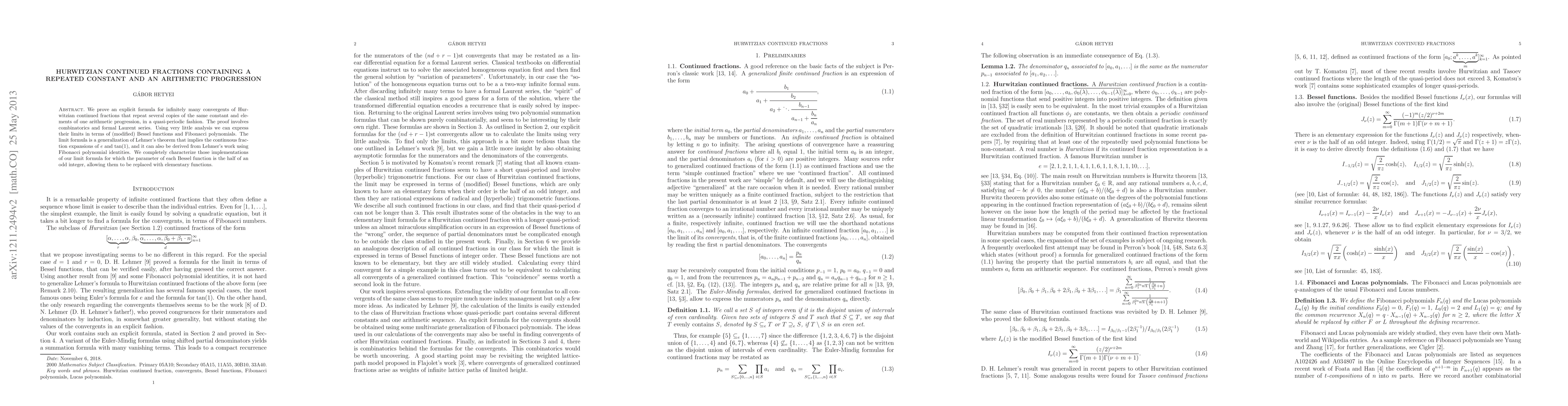 This paper proves an explicit formula for the convergents of Hurwitzian continued fractions that repeat a constant and elements of an arithmetic progression. The formula generalizes Lehmer's theorem and expresses limits in terms of modified Bessel functions and Fibonacci polynomials, with special cases allowing substitution with elementary functions.