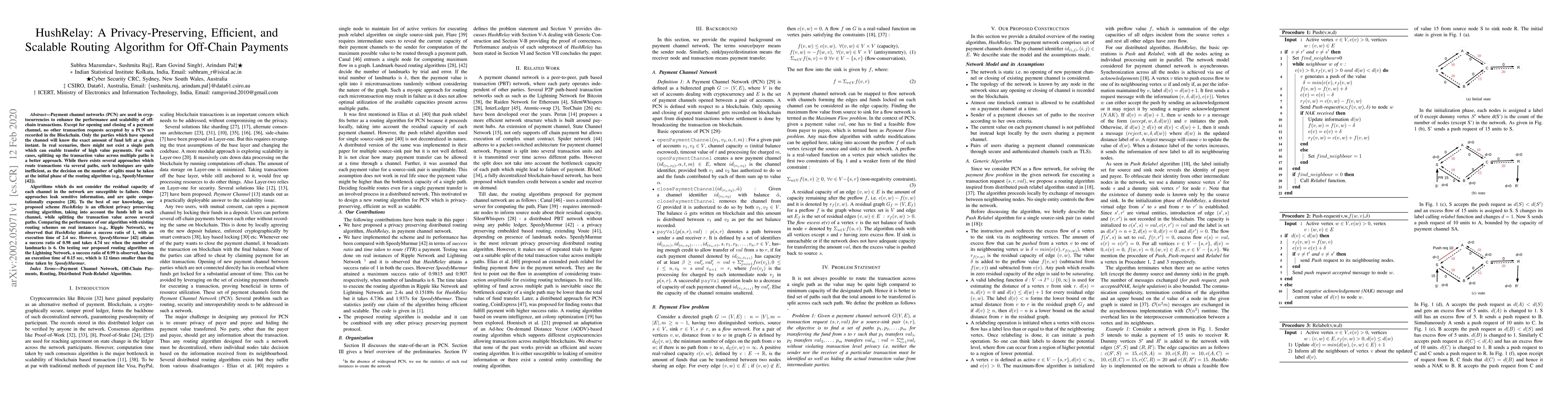 Payment channel networks (PCN) are used in cryptocurrencies to enhance the performance and scalability of off-chain transactions. Except for opening and closing of a payment channel, no other transaction requests accepted by a PCN are recorded in the Blockchain. Only the parties which have opened the channel will know the exact amount of fund left at a given instant. In real scenarios, there might not exist a single path which can enable transfer of high value payments. For such cases, splitting up the transaction value across multiple paths is a better approach. While there exists several approaches which route transactions via several paths, such techniques are quite inefficient, as the decision on the number of splits must be taken at the initial phase of the routing algorithm (e.g., SpeedyMurmur [42]). Algorithms which do not consider the residual capacity of each channel in the network are susceptible to failure. Other approaches leak sensitive information, and are quite computationally expensive [28]. To the best of our knowledge, our proposed scheme HushRelay is an efficient privacy preserving routing algorithm, taking into account the funds left in each channel, while splitting the transaction value across several paths. Comparing the performance of our algorithm with existing routing schemes on real instances (e.g., Ripple Network), we observed that HushRelay attains a success ratio of 1, with an execution time of 2.4 sec. However, SpeedyMurmur [42] attains a success ratio of 0.98 and takes 4.74 sec when the number of landmarks is 6. On testing our proposed routing algorithm on the Lightning Network, a success ratio of 0.99 is observed, having an execution time of 0.15 sec, which is 12 times smaller than the time taken by SpeedyMurmur.