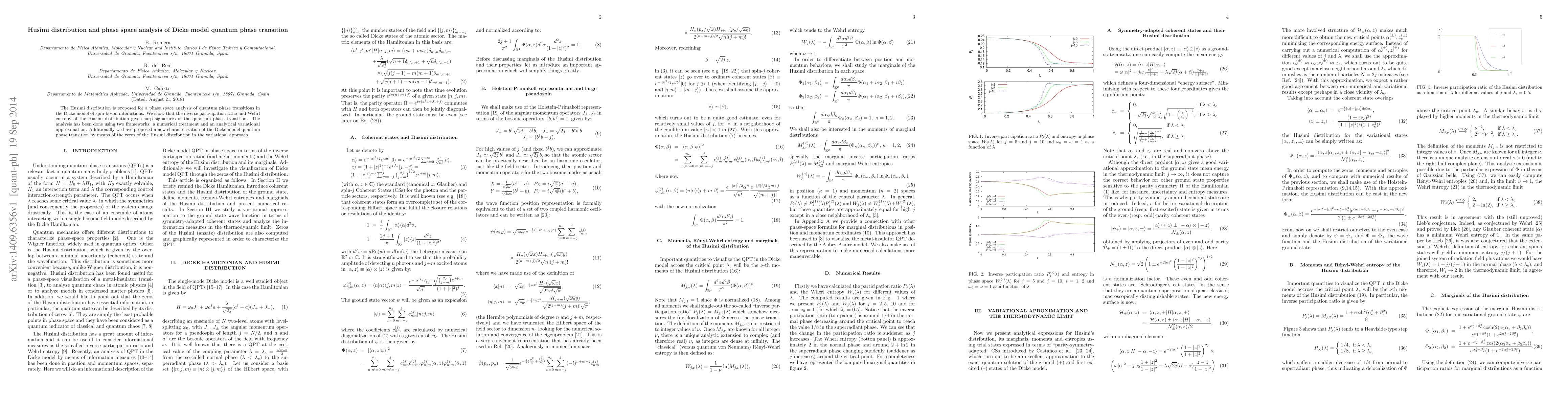 This paper uses the Husimi distribution for phase space analysis to identify signatures of quantum phase transitions in the Dicke model, employing both numerical and analytical methods. It introduces new characterizations of the transition via the inverse participation ratio, Wehrl entropy, and zeros of the Husimi distribution.