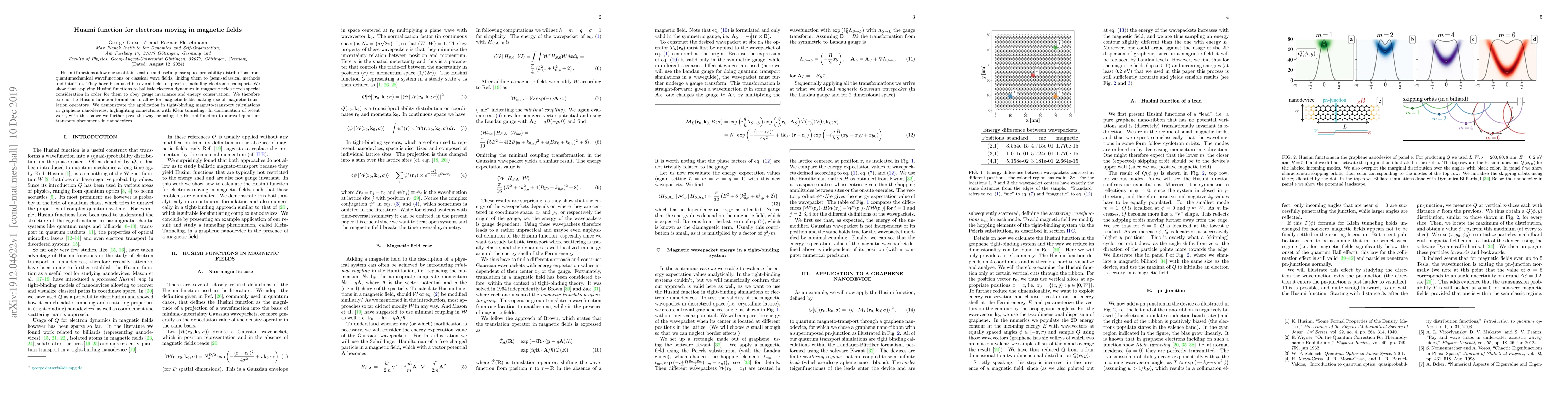 This paper extends the Husimi function formalism to account for electrons in magnetic fields, ensuring gauge invariance and energy conservation. It applies the modified formalism to graphene nanodevices, demonstrating its utility in understanding magneto-transport and Klein tunneling.