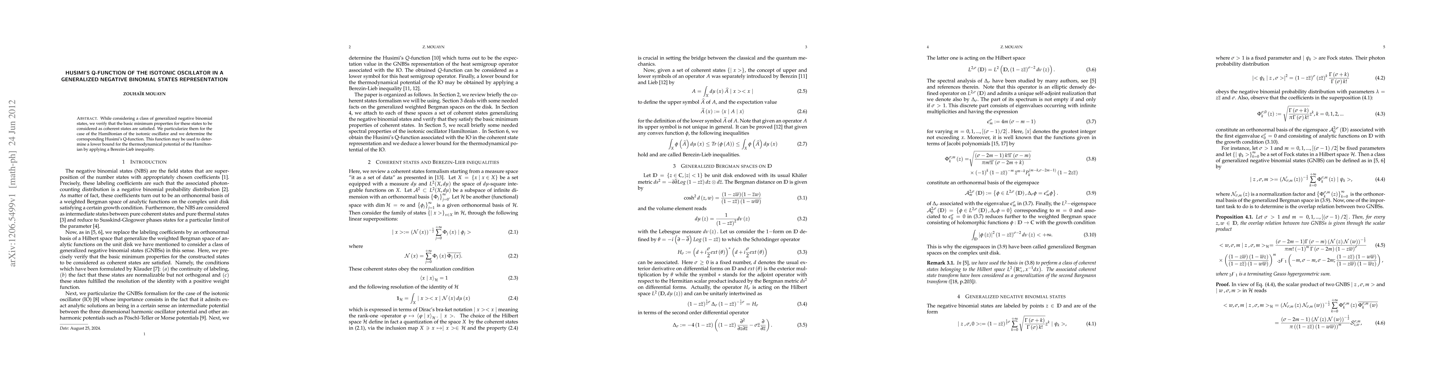 This paper investigates the properties of generalized negative binomial states for the isotonic oscillator, confirming their coherence and deriving the corresponding Husimi's Q-function, which can be used to establish a lower bound for the thermodynamical potential via the Berezin-Lieb inequality.