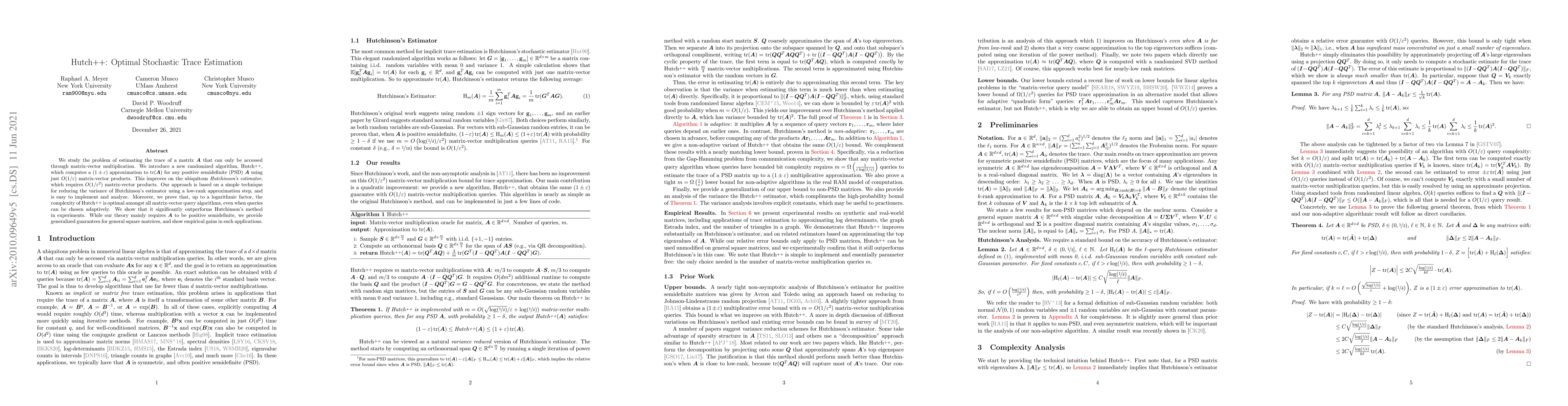 Hutch++ is a new randomized algorithm for estimating the trace of a matrix accessed only via matrix-vector multiplication, requiring $O(1/\epsilon)$ matrix-vector products for a $(1 \pm \epsilon)$ approximation. It improves upon Hutchinson's estimator by reducing variance and achieving optimal complexity.